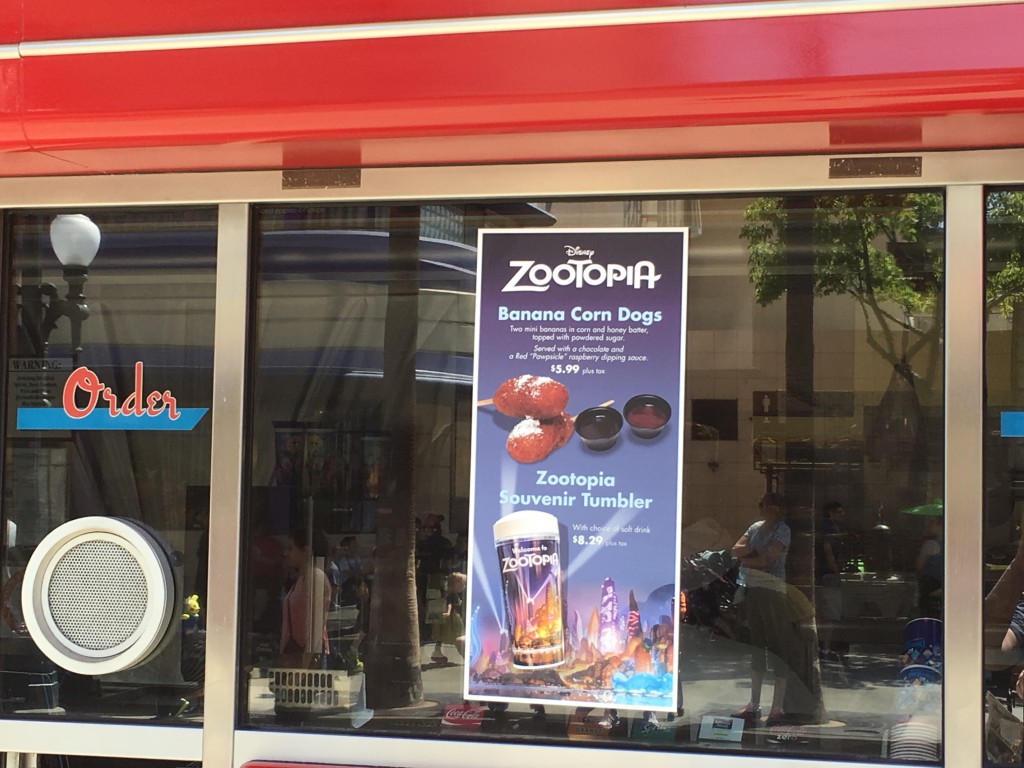 Finally, Award Weiners has some special menu items to celebrate the animated film. Banana Corn Dogs feature two bananas that are dipped in a corn and honey batter and topped with powdered sugar. It is paired with a duo of chocolate and ‘red paw-psicle’ (raspberry) dipping sauces. Also available is a Zootopia Souvenir Tumbler