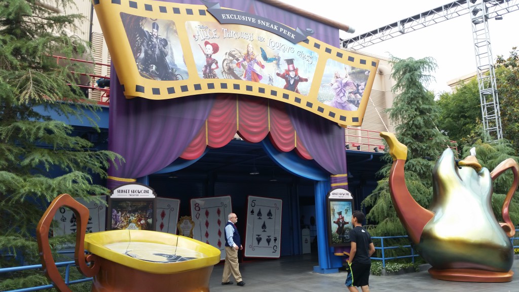 A special 10-minute preview of Alice Through the Looking Glass in 3-D is currently screening at Disney California Adventure. Special in-theater effects and a fun interactive kiosk found in the theater’s lobby add to the experience during this presentation's run from May 6 – June 12, 2016 you can enjoy at the Sunset Showcase Theater (the old MuppetVision theater that recently housed a Frozen Sing-Along).