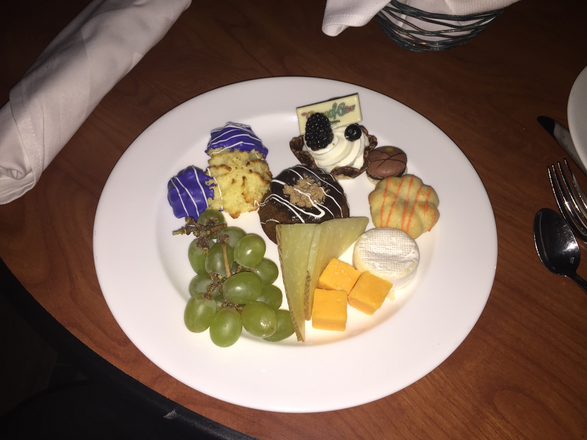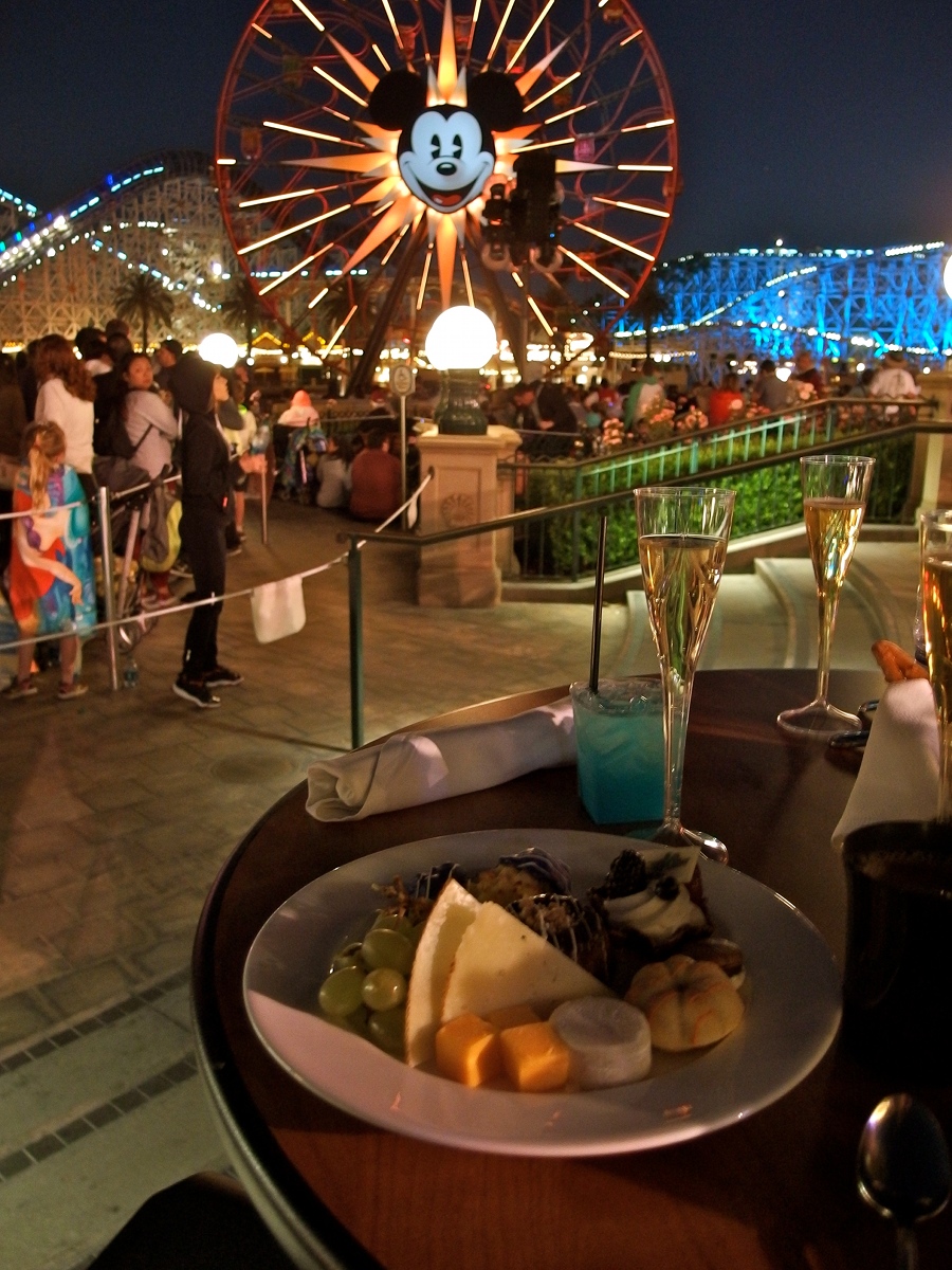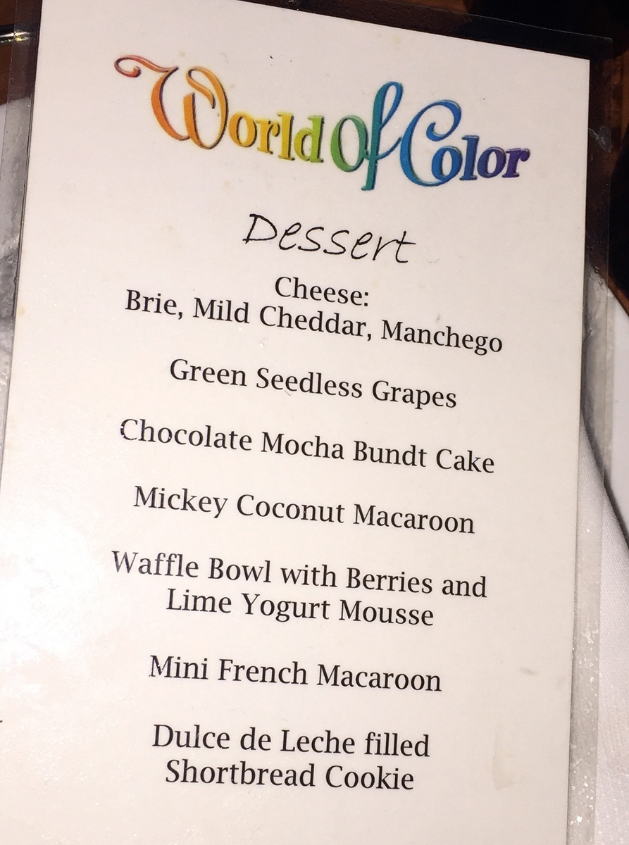 There are a variety of seating choices, all affording a clear view of World of Color—Celebrate! Ticketed guests arrive early and make their way to a specially marked waiting area before the show begins. Once seated, guests are served tableside. A breadbasket is offered with a plate of cheeses, fruit and desserts. The selection consists of: