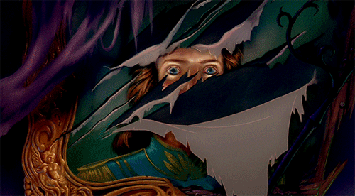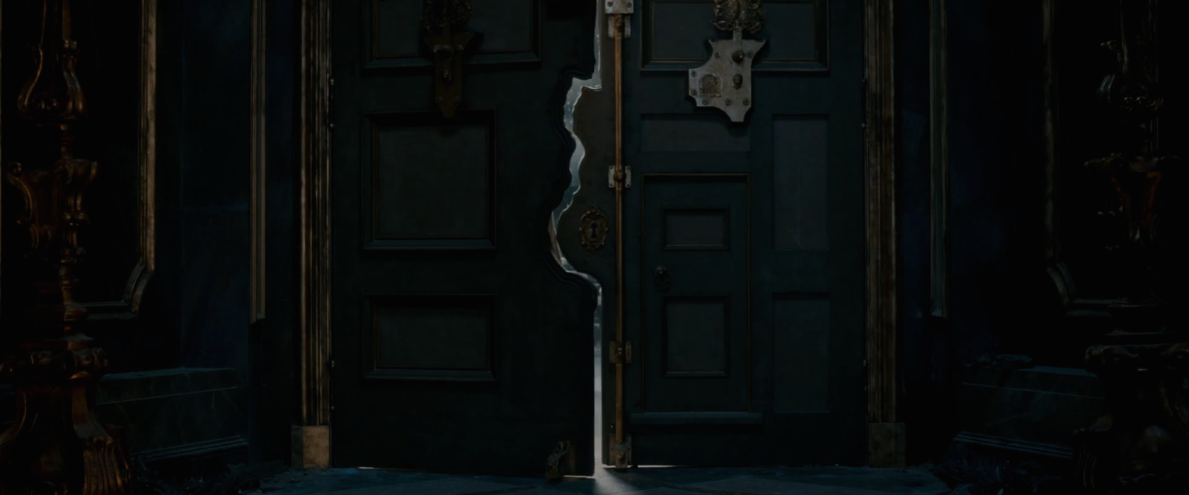 Belle slowly opens the door to the castle, which has already been broken in, possibly by Maurice as he seeks shelter from the wolves in the forest. It is now when we receive our first bit of dialogue: