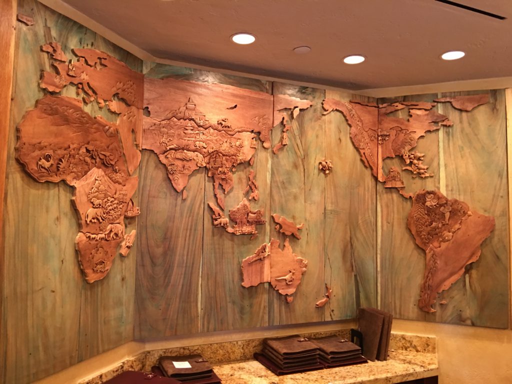 Guests are greeted at the front desk and issued a pager and invited to sit in the lobby area or enjoy the Nomad Lounge. The check-in desk has a beautiful carved wood map of the world with small castles representing each location of a Disney Park including the soon to be open Shanghai Disneyland.