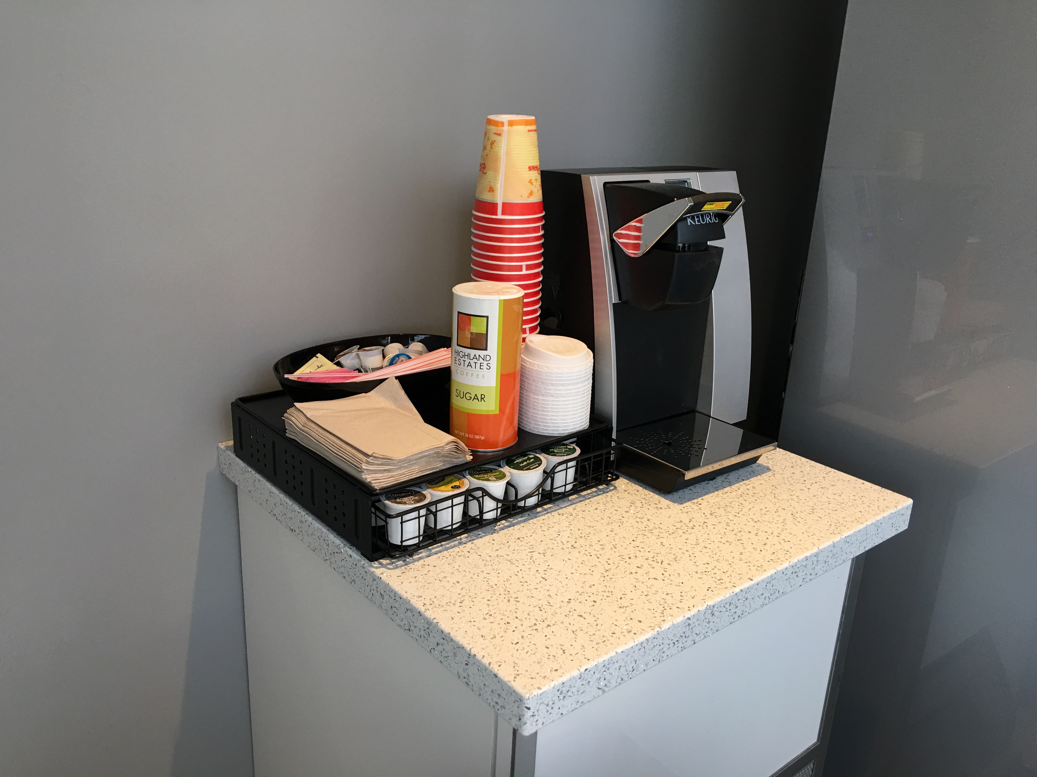 My favorite benefit that the lounge has to offer would be the Coke Freestyle machines where guests can enjoy one of over 100 Coke products. But, if on one of those rare days you need something to help warm your bones, there is also a Keurig machine with a few options of K-Cups.