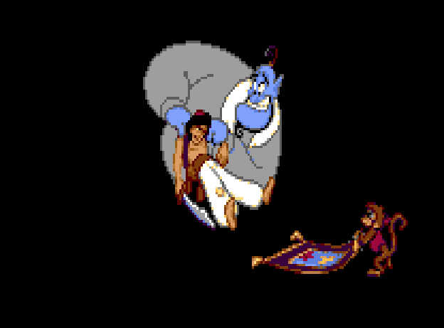 Despite the temporary difficulty I experienced adjusting from the console version to the computer (some moves were fairly obvious like using the arrows to move and spacebar to jump while using “option” to throw apples and “control” to brandish my sword took some hunting and pecking), the memories and mechanics of the game came back to me right away. Unfortunately, I was also reminded just how much I sucked at it! In fact, the detail I remembered most from the game, as it turns out, is the image of Genie rubbing Aladdin’s shoulders after the street rat’s life meter had depleted: