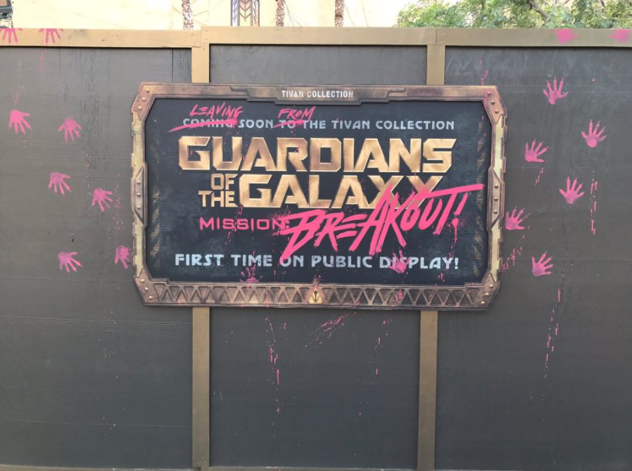 One of the small details we learned is that, as the story goes, Rocket Racoon managed to spill a bucket of paint while making his escape. Thus, riders will apparently follow in his literal tracks and footsteps in order to free the other Guardians. This plot element is actually included on the construction wall sign that was recently erected outside of the attraction: