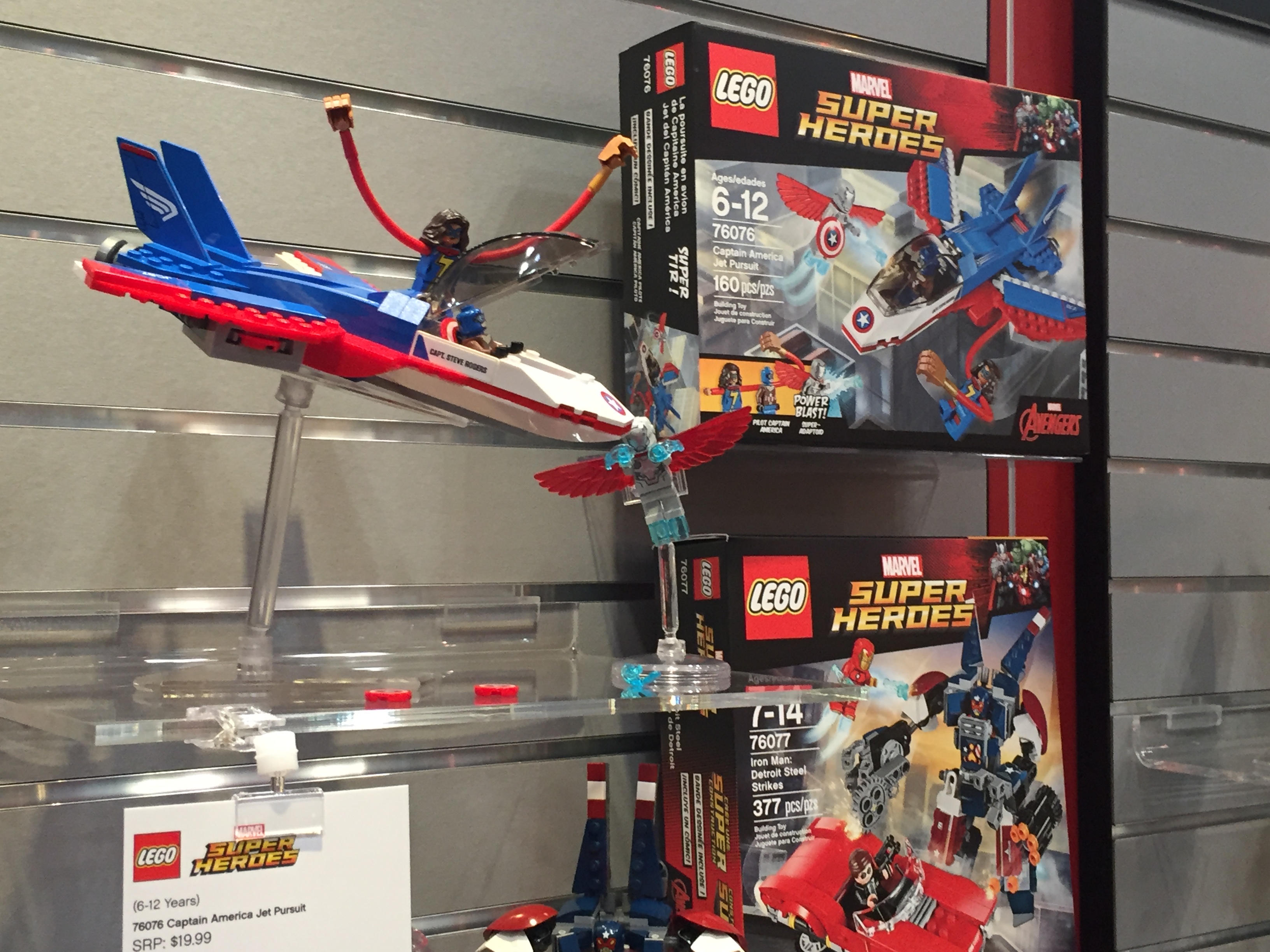 Captain America Jet Pursuit $19.99 160 pieces Captain America, Ms. Marvel, and Falcon come in this neat jet set which includes some fun play-action.
