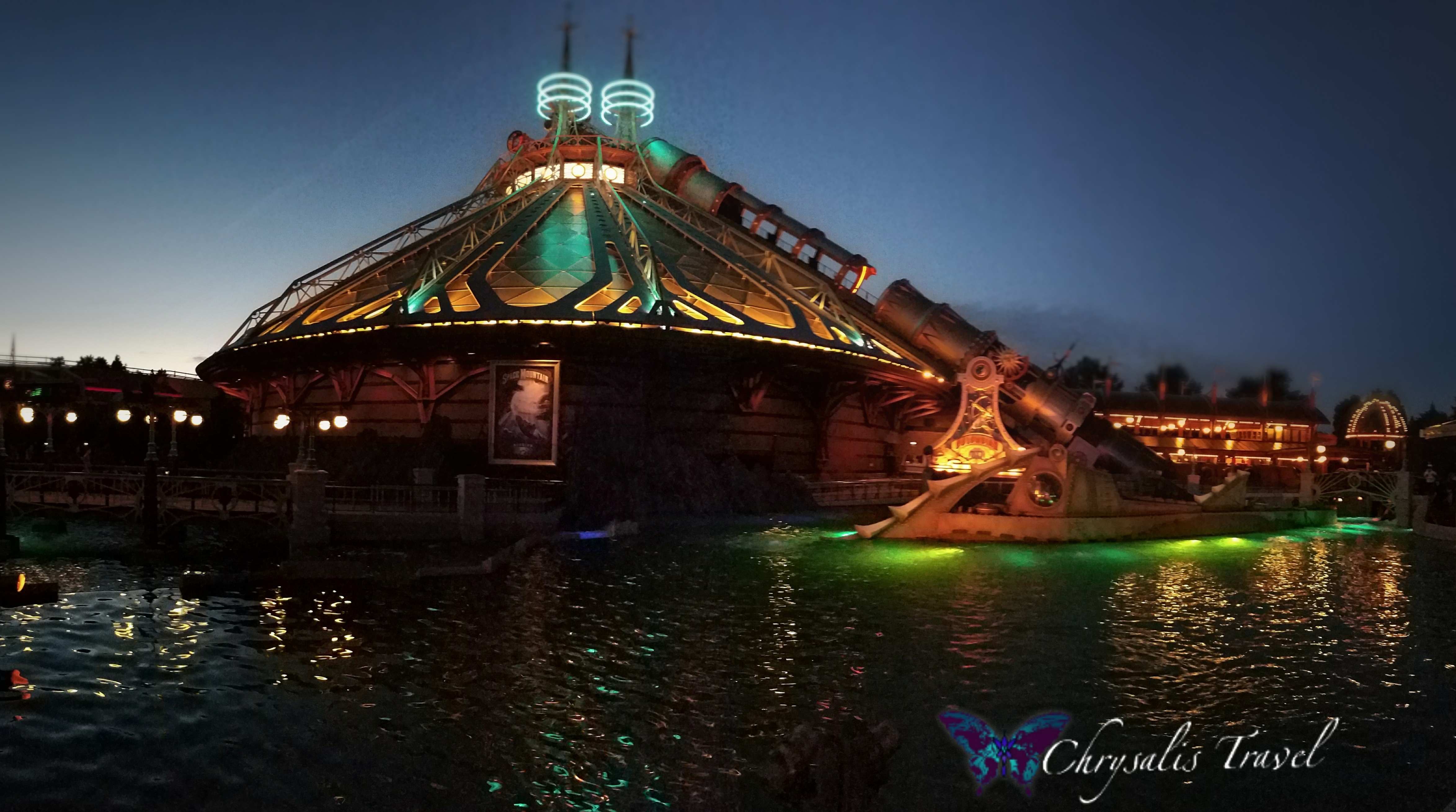 The unique styling of the exterior is a throwback to Jules Verne, and is very fashionable with the popularity of steampunk design. The newest overlay is the Star Wars-themed Hyperspace Mountain – to accompany the re-opening of Star Tours in 3D.