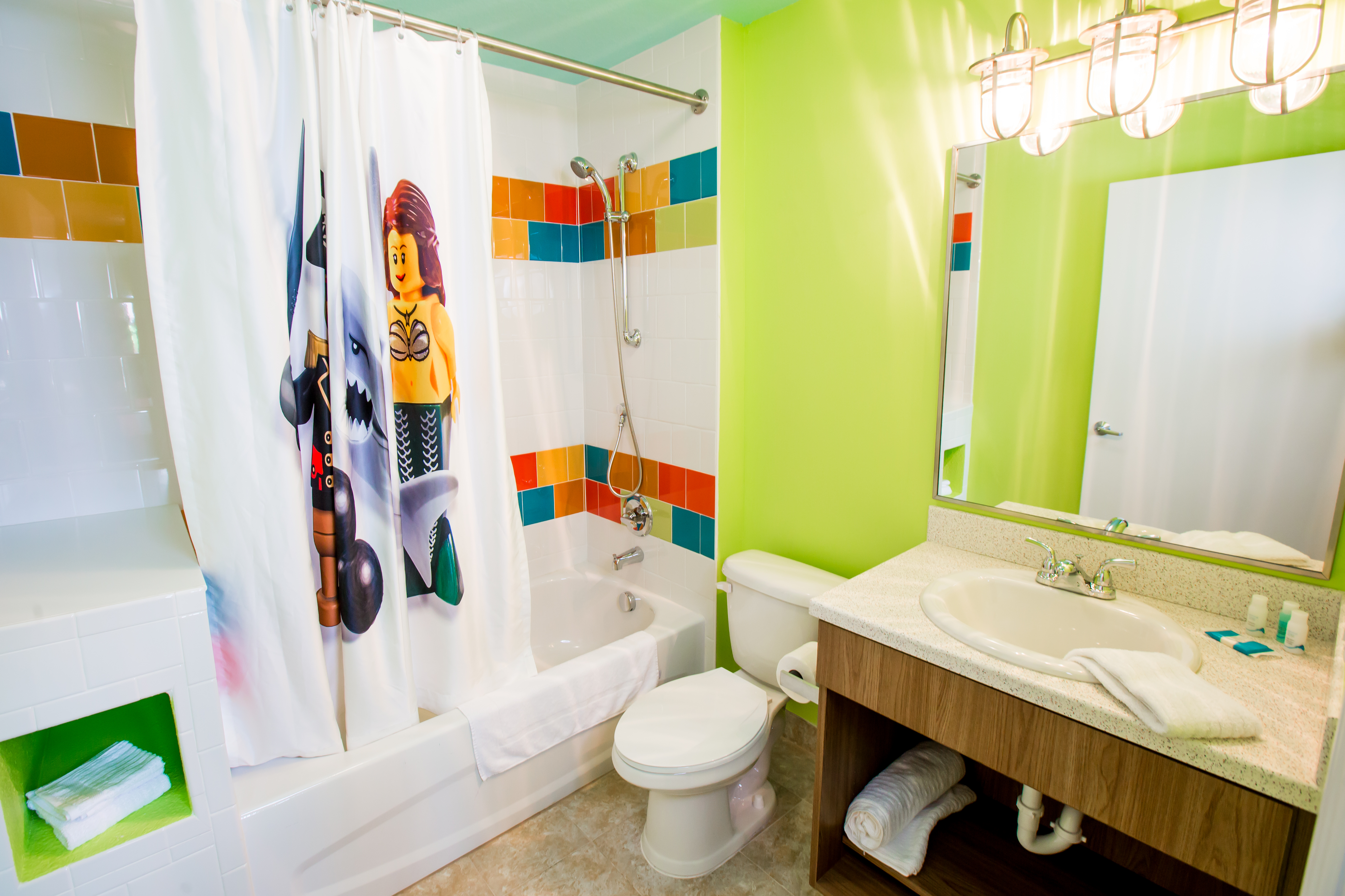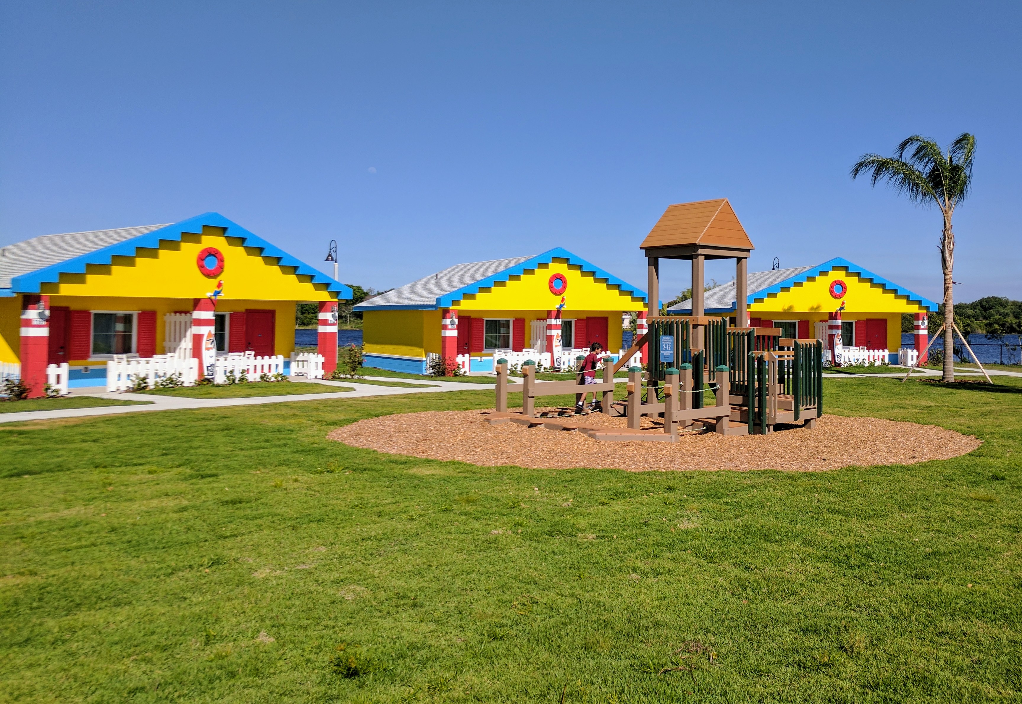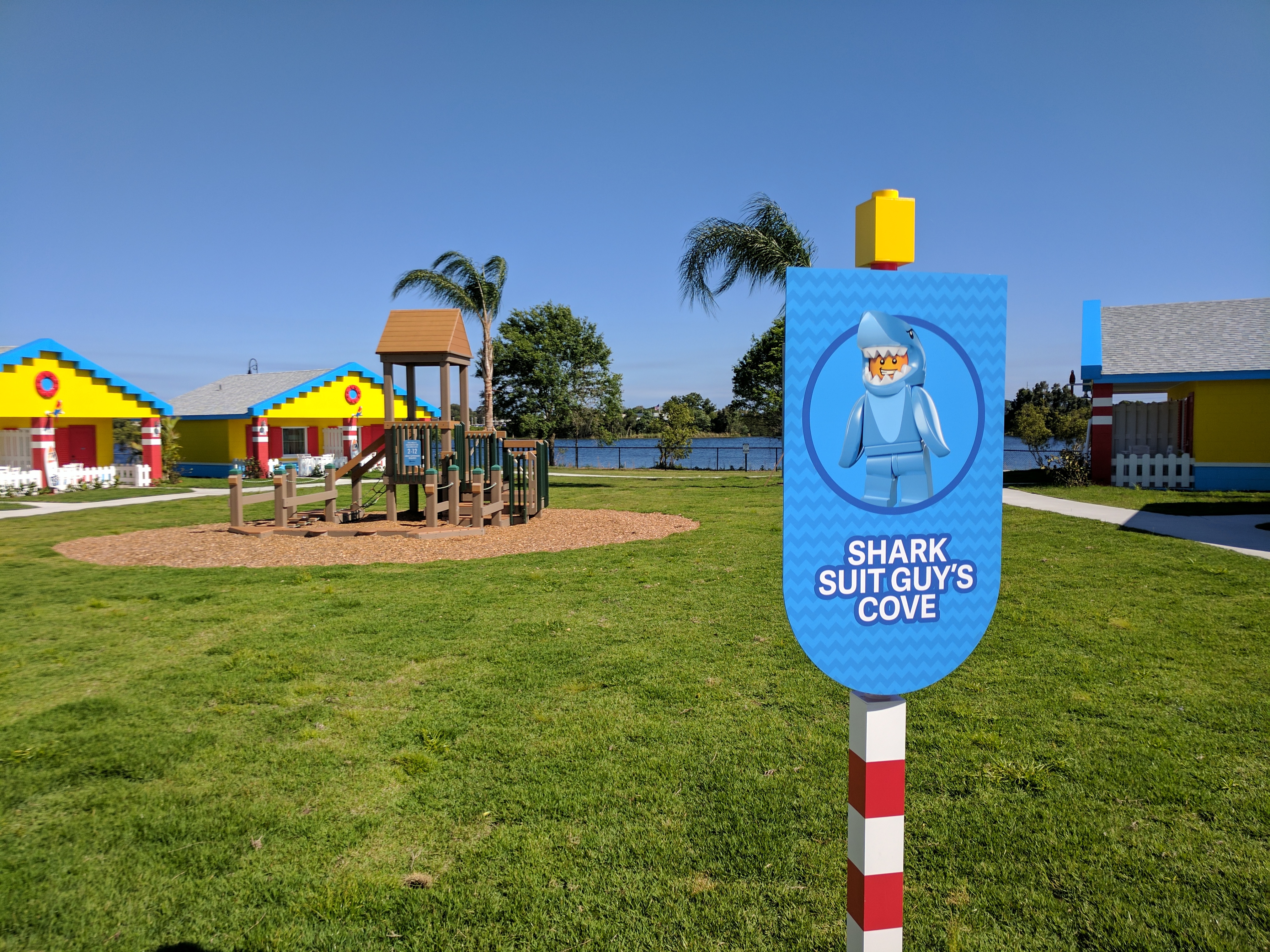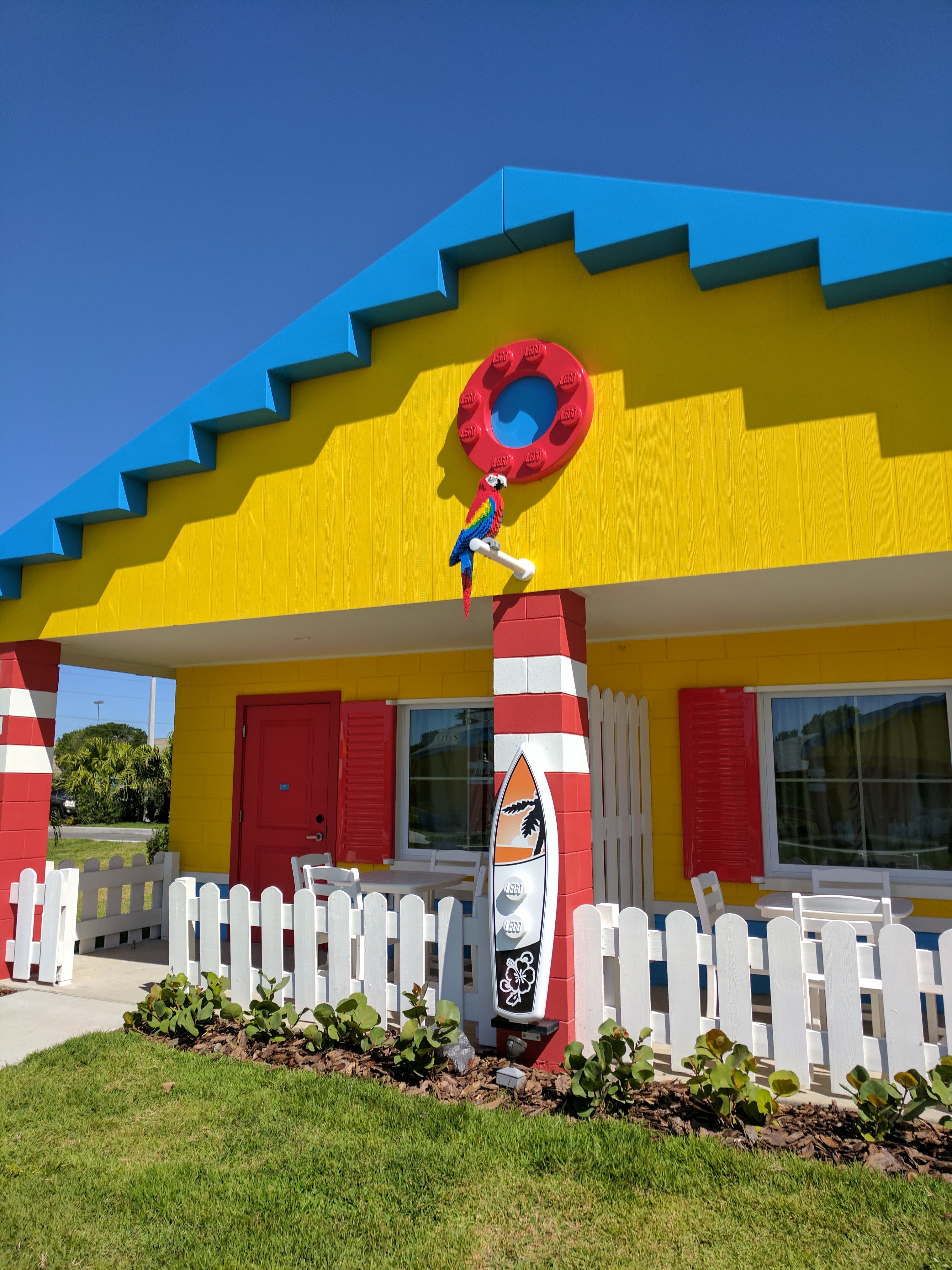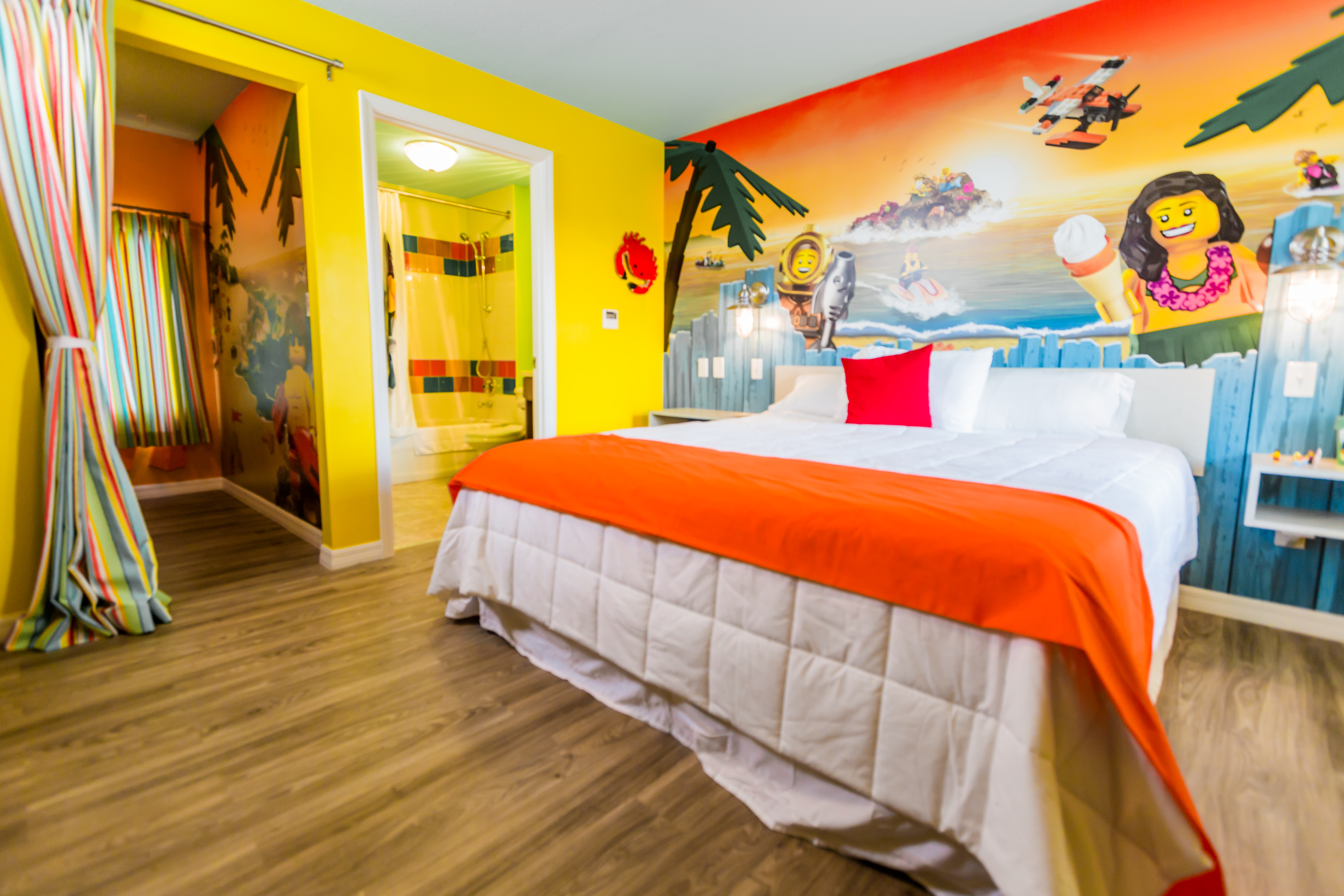 Enjoy a respite from the hustle and bustle of your theme park adventures with a stay at the LEGOLAND Beach Retreat. Set alongside a small lake near Legoland Park, the resort is laid out in sets of cozy coves, a collection of bungalows that ring a central play zone. These brightly colored buildings appear to be made of supersized Legos. We loved the beautiful dimensional parrot Lego sculpture and Lego-styled surfboard that sits out front.