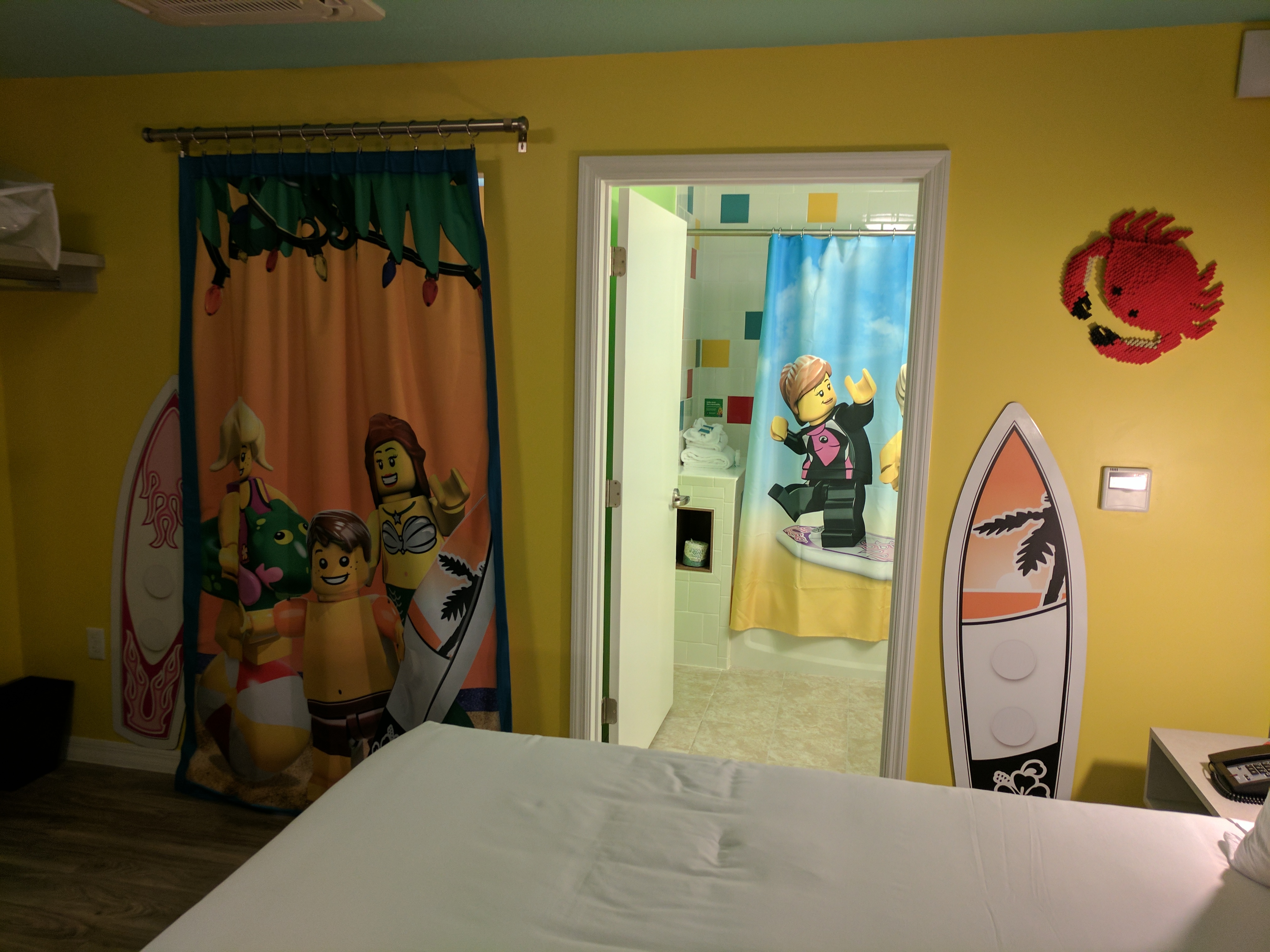 The bathroom is a great size. Plenty of room help littler ones towel off before heading into the main room. But, for larger occupancy setups like this, I’m a big fan of the split bathroom design that isn’t found here. However, many design touches showcased a desire to meet the needs of their younger clientele and were appreciated -- a morning newspaper highlighting Legoland events and offering Lego themed stories, lower hooks in the bathroom, a built-in toilet seat adapter for small ones, a night light option in the main room and, in the second room, USB outlets only rather than electrical sockets.