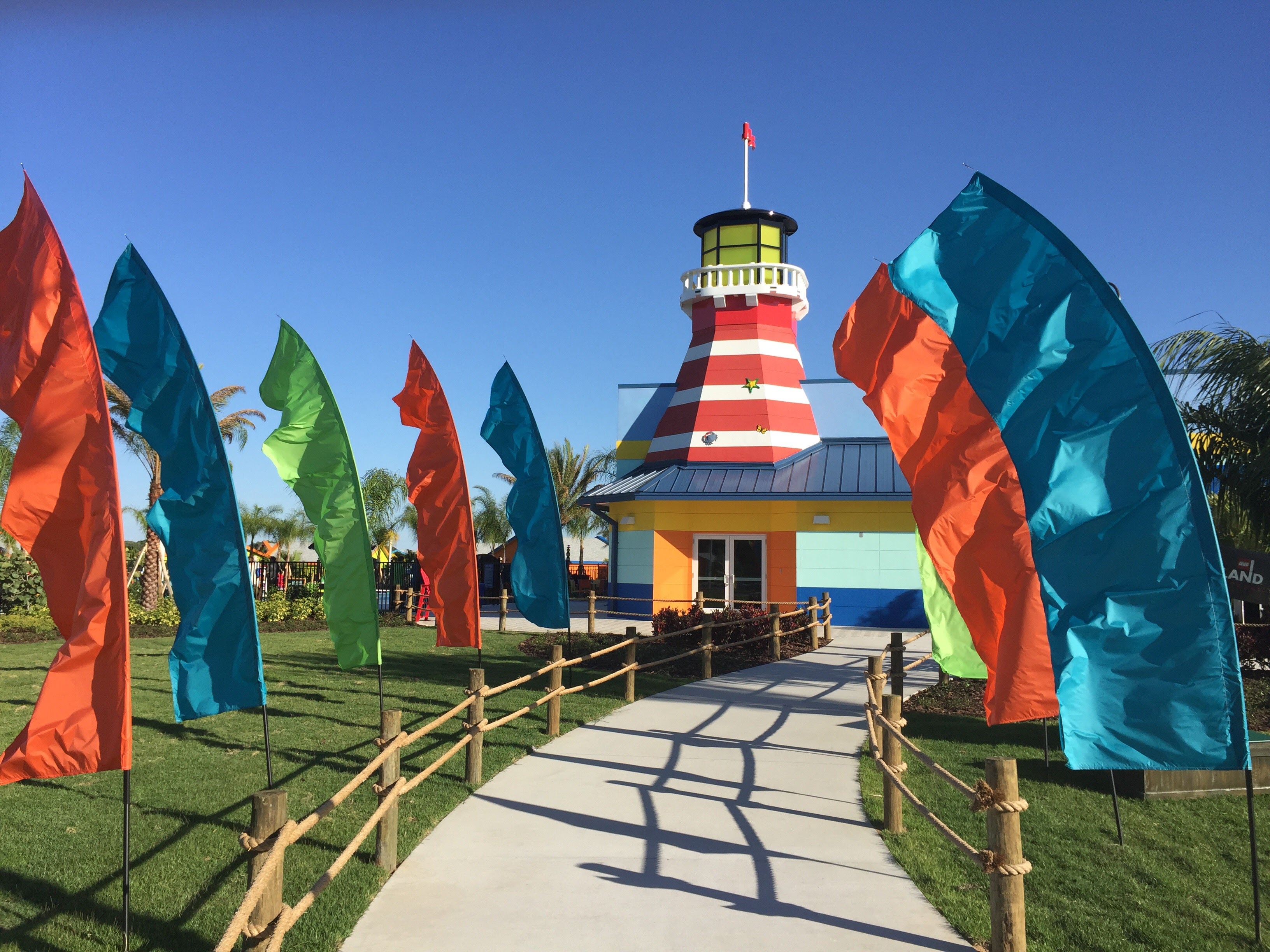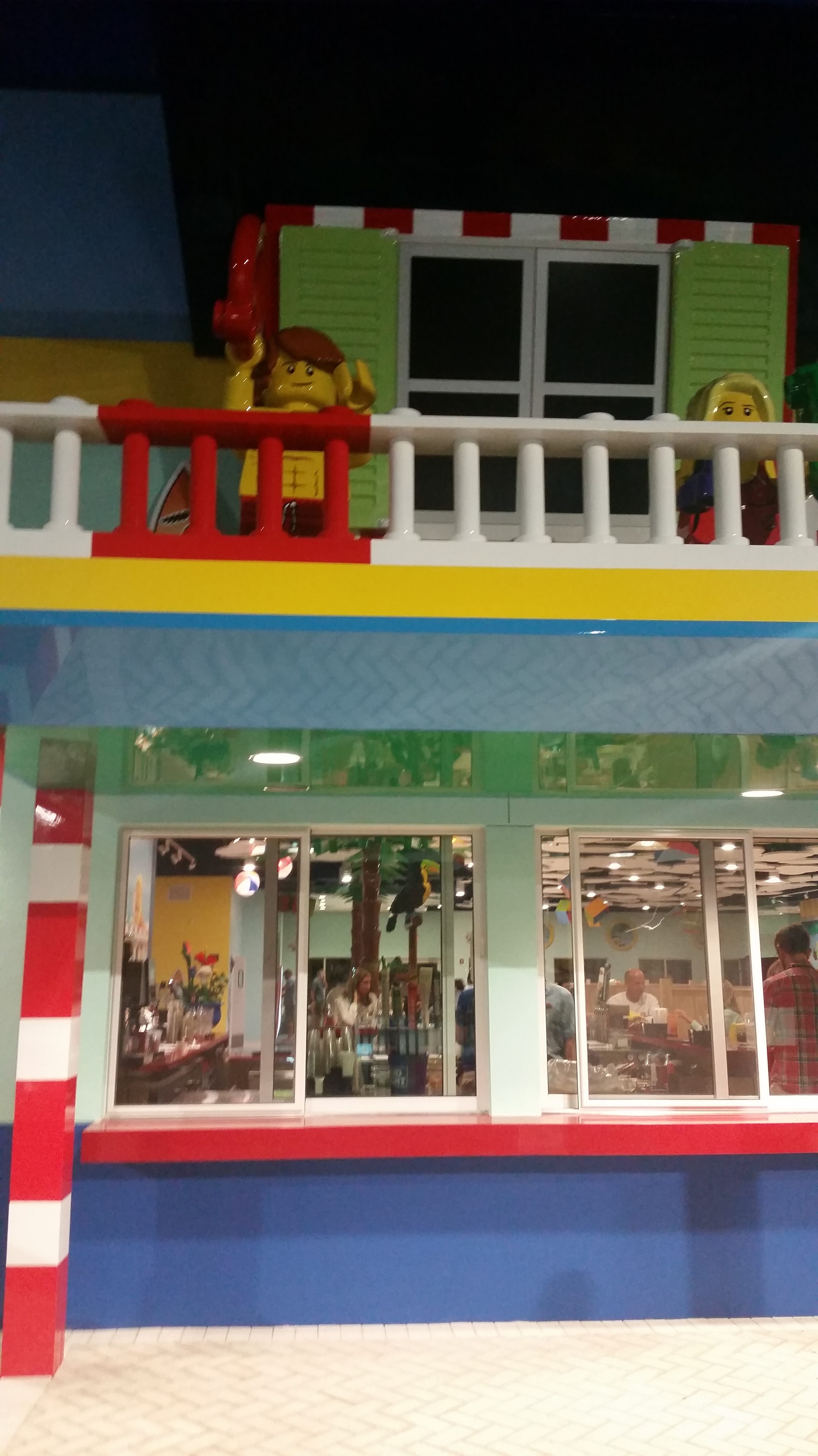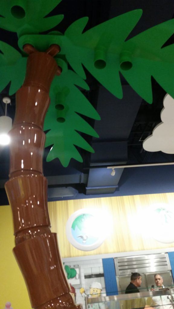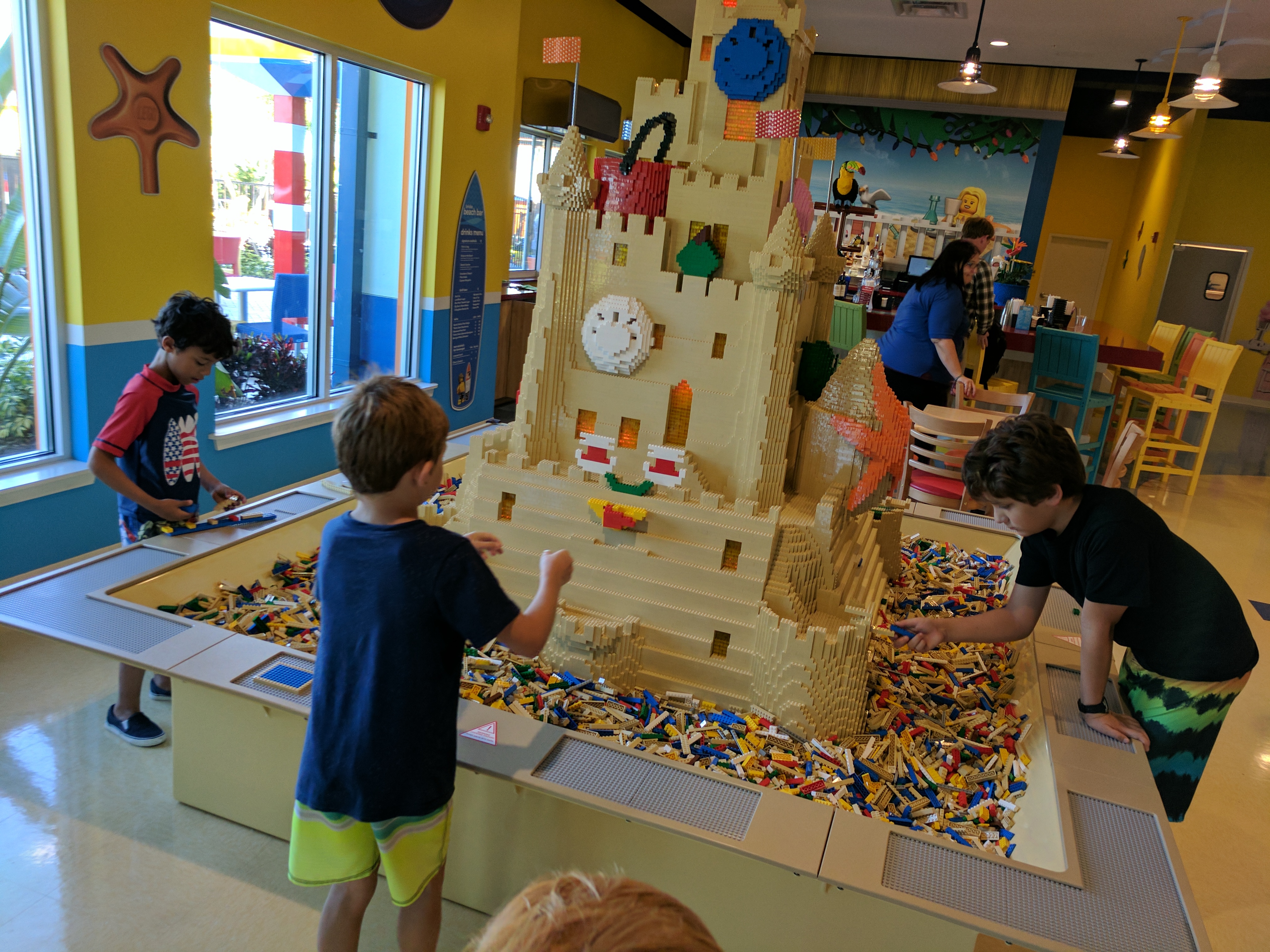 The center of the Legoland Beach Retreat's activities are found beneath its red & white striped lighthouse icon. Inside, you’ll find the info desk, their gift shop, the Palm Tree Traders with Lego sets, Legoland souvenirs and a few sundries. Just beyond the giant Lego sandcastle -- that you are invited to build upon -- is Sandy’s Castle Restaurant, a buffeteria that offers the complimentary all-you-care-to-enjoy breakfast in the morning with eggs, bacon, tater tots, a wide array of fruits and cereals, pastries and more. There is also a moderately priced dinner buffet with a variety of Caribbean inspired dishes such as mahi, mahi, jerk chicken, plantain tostones, fajitas, peel and eat shrimp, noodle salad, watermelon salad, and child-friendly fare like chicken tenders and macaroni & cheese.