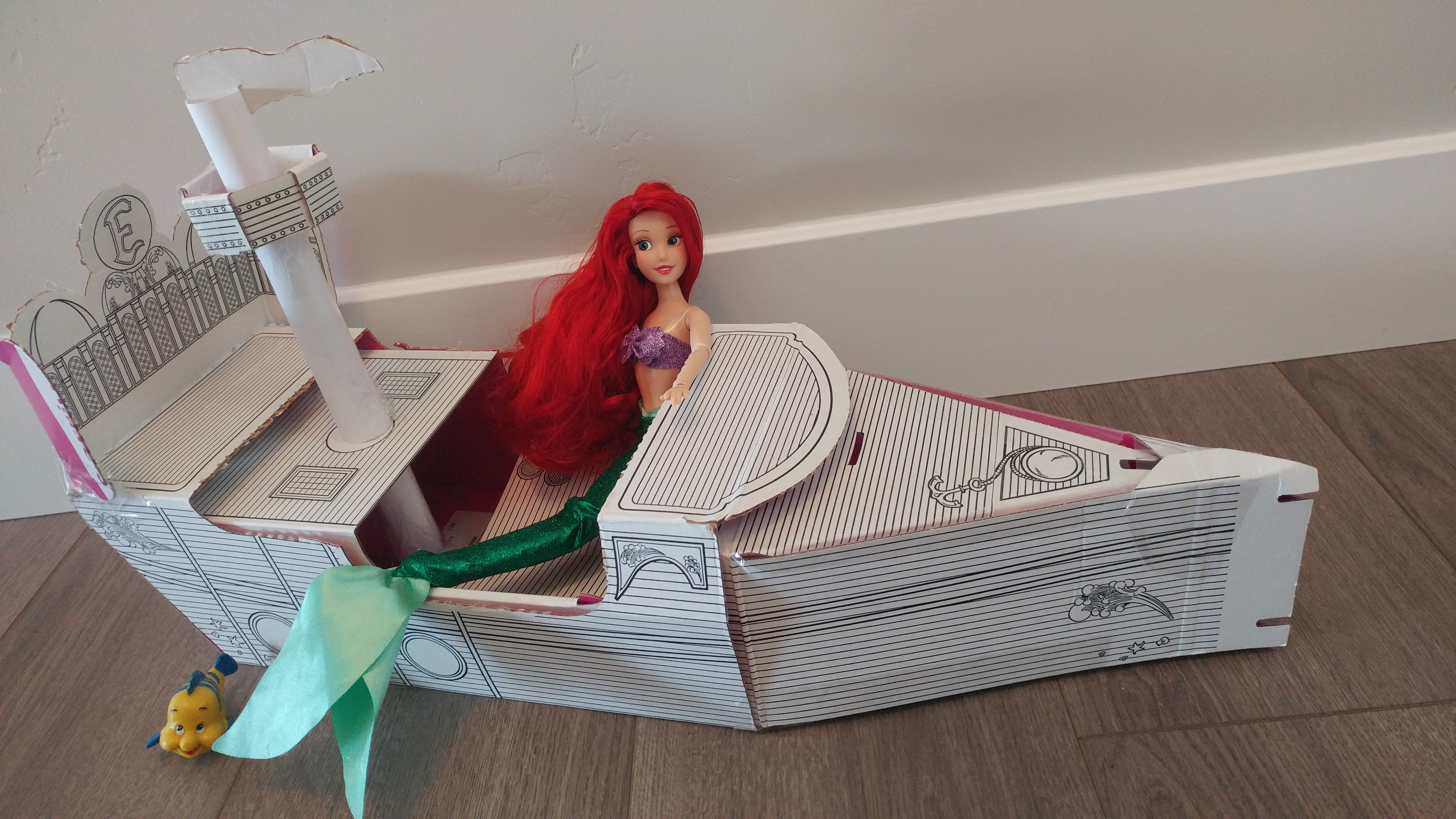 Items featured in this box are a beautiful Ariel doll with a small, plastic Flounder, Sunglasses featuring Ariel, cute Ariel pajamas, a magazine with stories, idea's on how to play, games, and more. As a reminder, open the box very carefully! The box doubles as a fun activity you can fold into something new for your little one to color. This box turned into Prince Eric's ship, which proved to be a little difficult to assemble. If you are familiar with ship terminology, then it will be a breeze, but if you are anything like me, you'll find yourself searching the internet to make sure you're connecting the right pieces together.