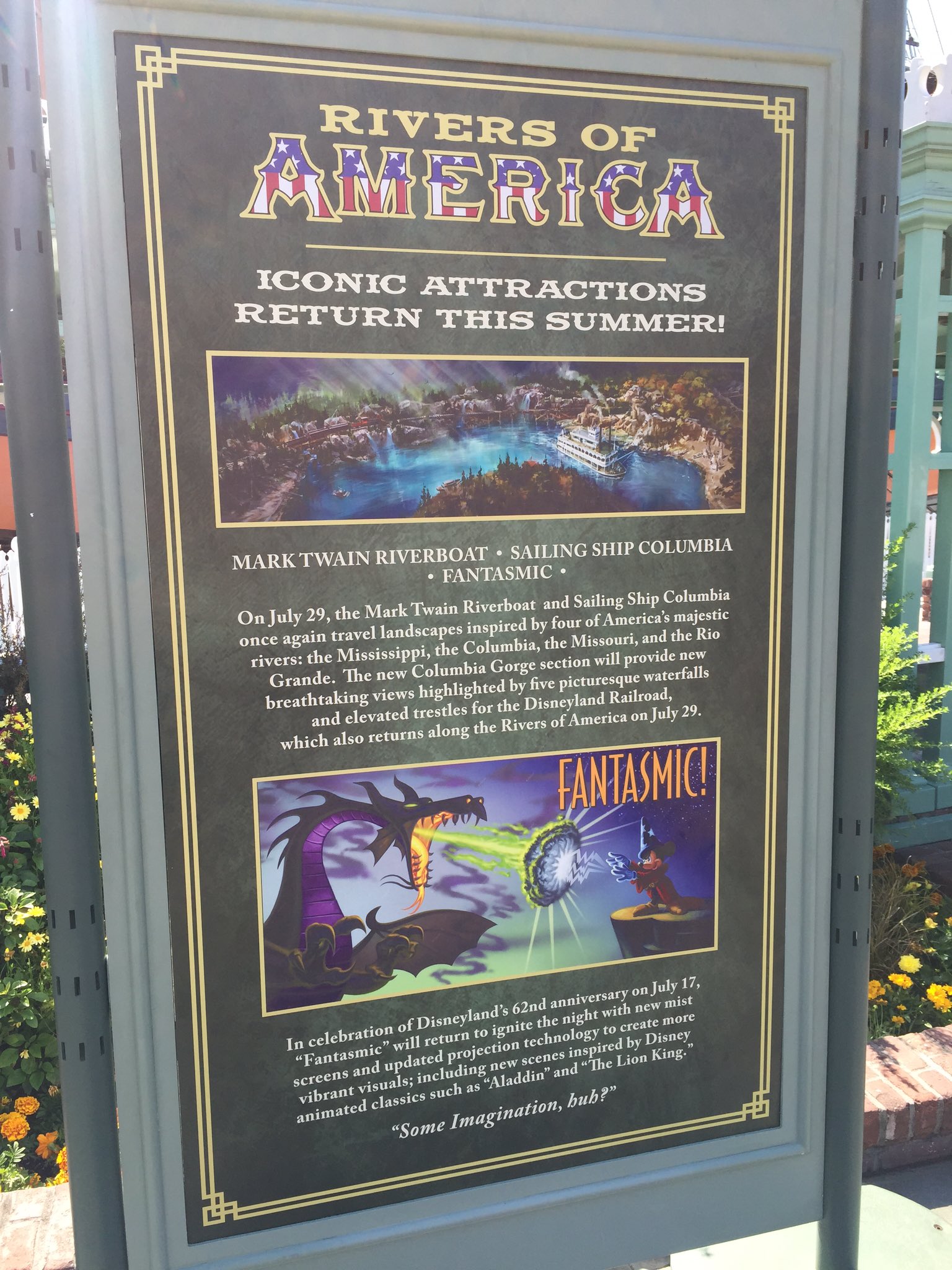 Speaking of the Disneyland Railroad, promotional signs have been put up around the park, touting the return of the famed Railroad and the Rivers of America attractions on July 29th as well as Fantasmic! on July 17th: