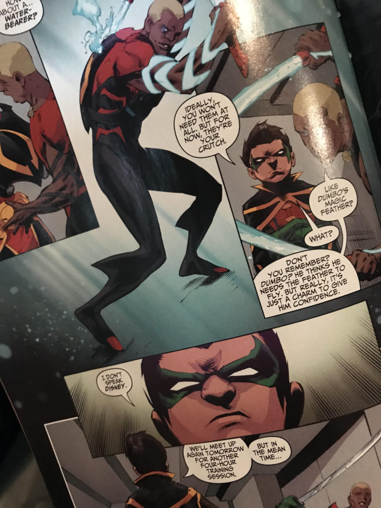 In today's issue of Teen Titans, which kicks off the Blood of the Manta storyline, Robin admits he isn't familiar with the Disney classics. In issue #9 of the current series, Aqualad is trying to describe an emotional crutch to Robin. He tries to use Dumbo's magic feather as an example.