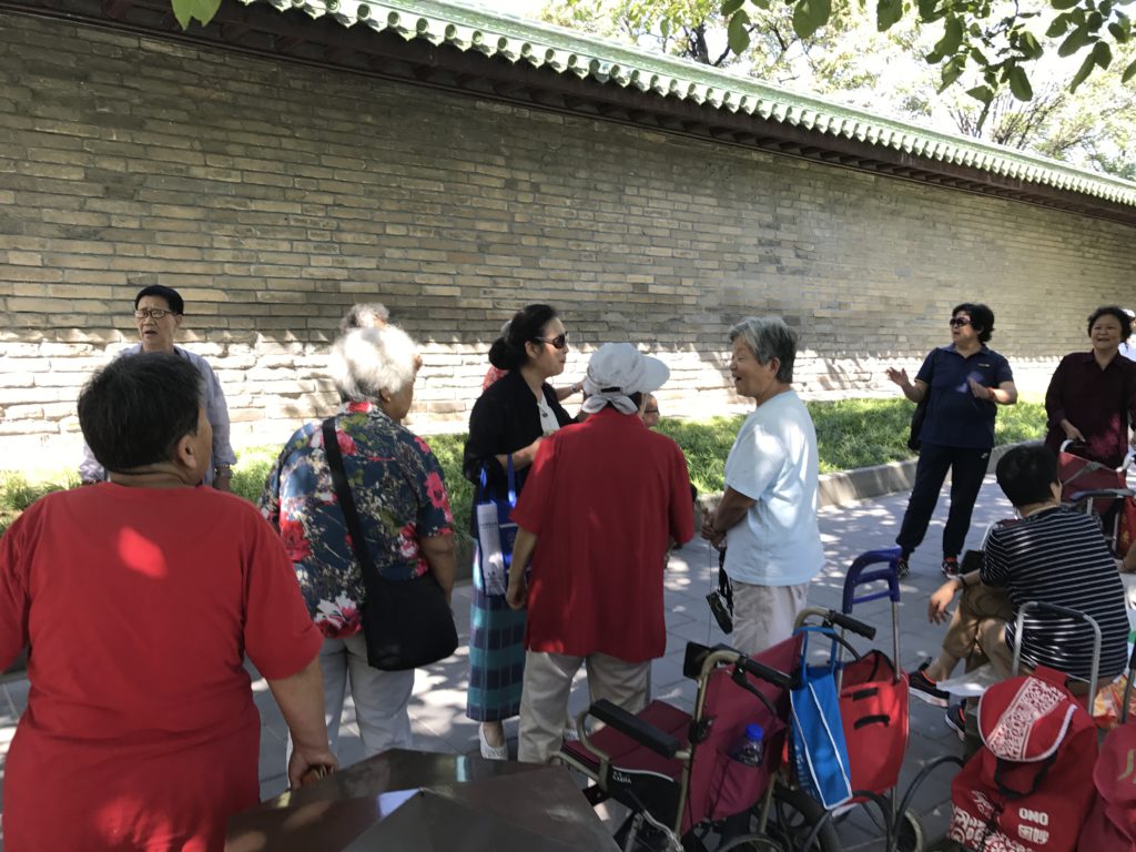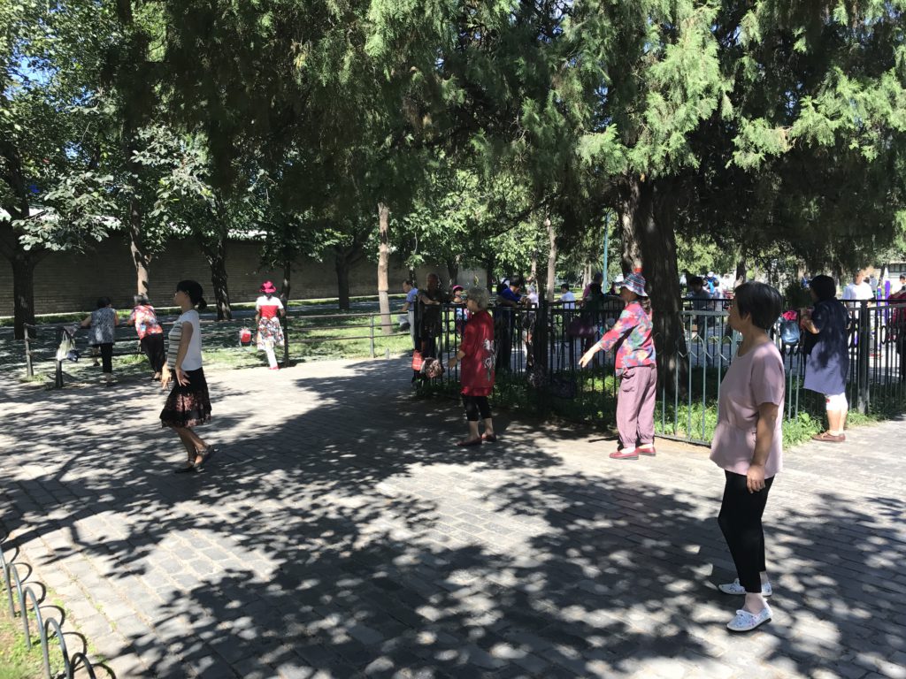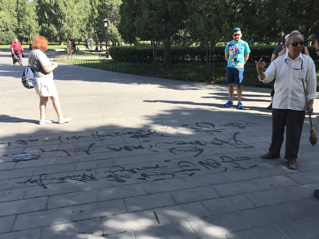 As we entered we saw a many writing caligraphy with water and a broom. You may have seen Disney custodial cast members draw Disney characters in a similar manner. We then walked through the park where we saw many senior citizens playing cards, conversing, and exercising. Apparently they can buy annual passes to the park and they visit frequently to enjoy the park and be social with other regular park goers. Sound familiar?