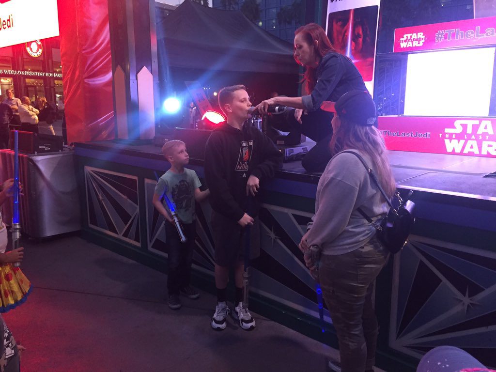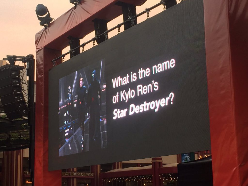 Meanwhile, at the Disneyland Resort, fans gathered at Downtown Disney for the trailer debut. In front of the AMC Theatres, There was a DJ, a Talk Like a Wookie contest, and Star Wars trivia. The festivities drew quite a crowd and many lightsabers.