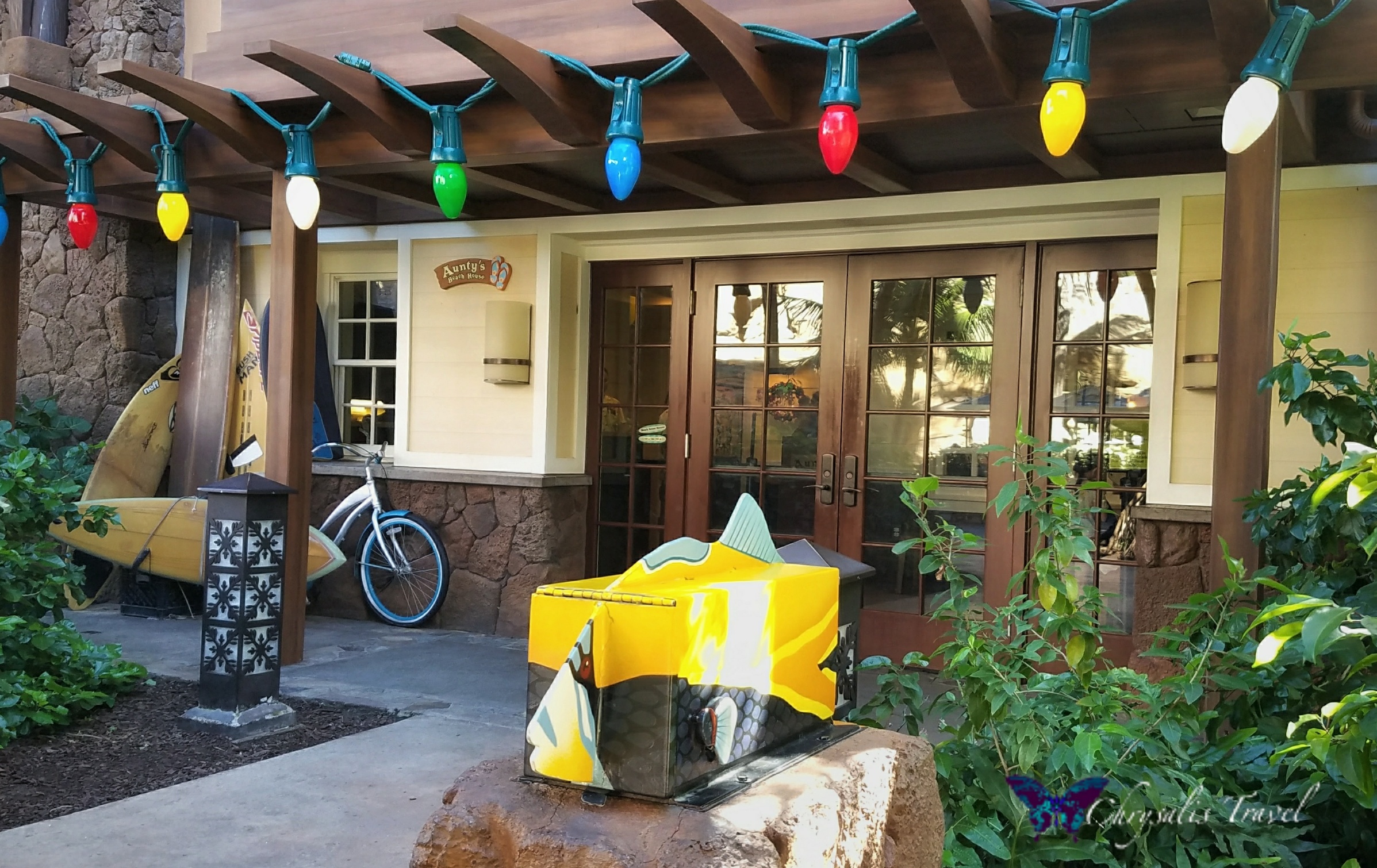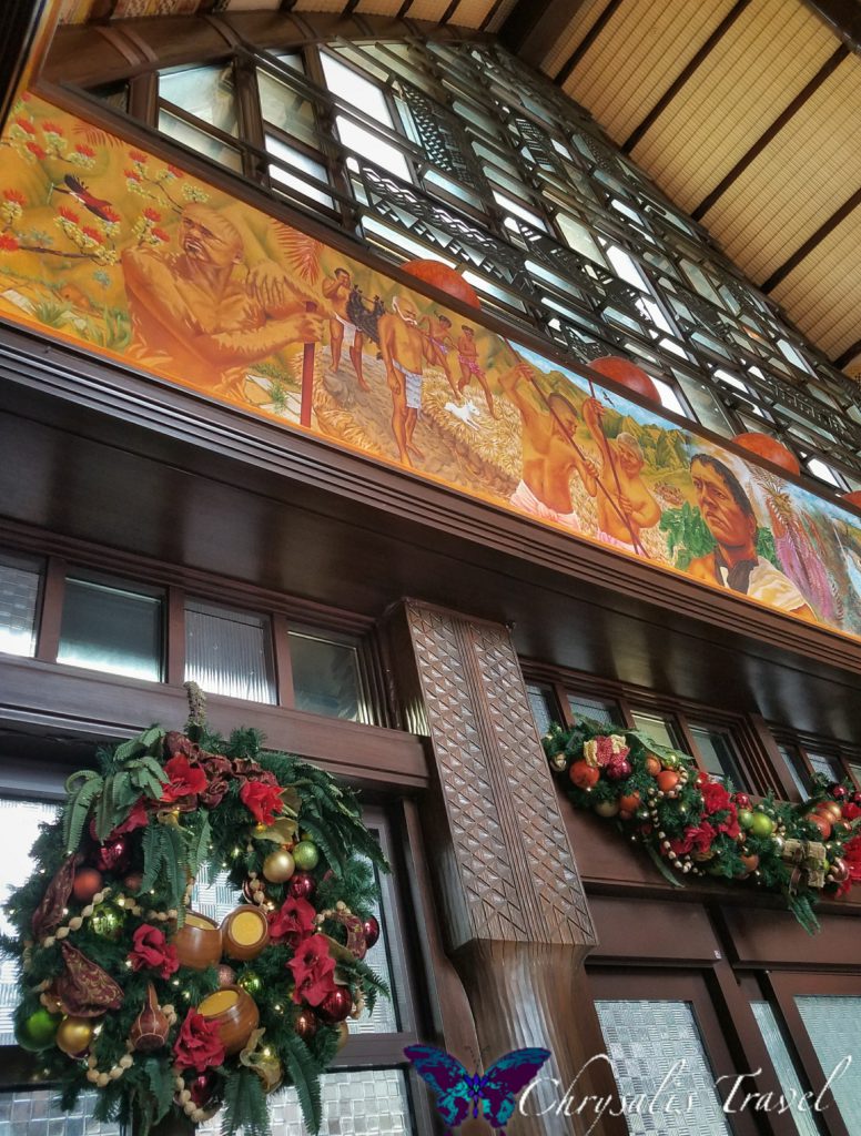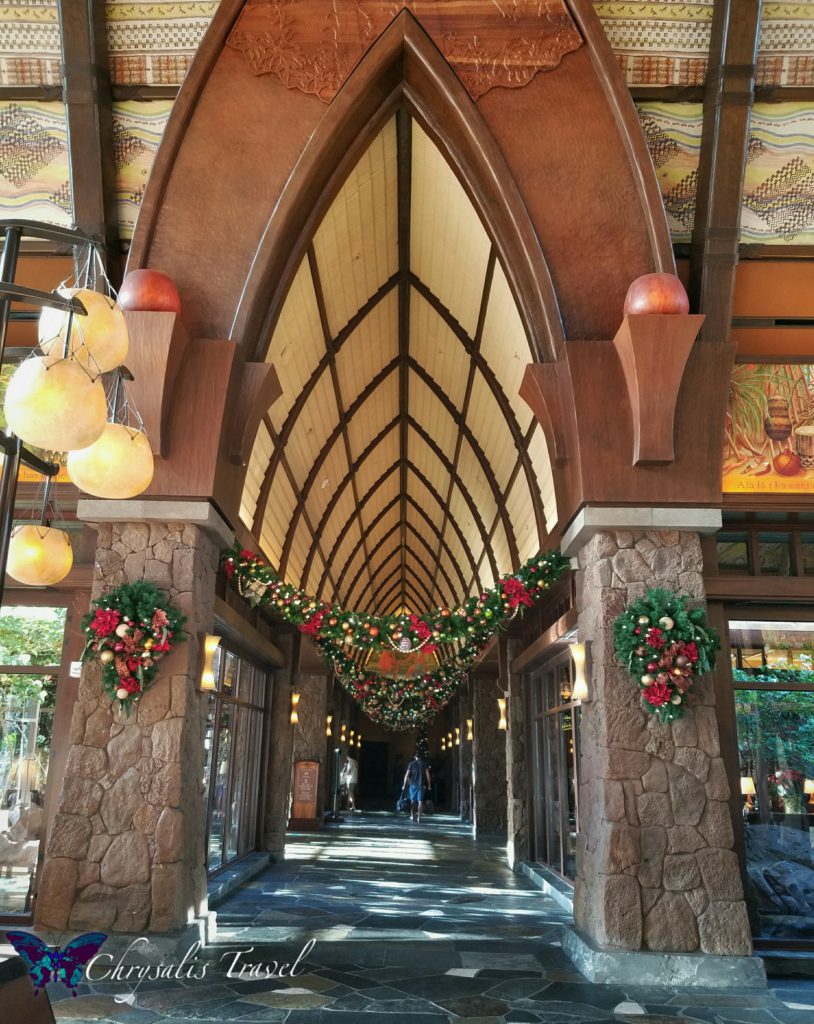 Ready to escape the snow and cold? Aulani is a great destination to celebrate the holidays! Enjoy tropical weather (an average 73o F) without sacrificing any of your favorite Disney holiday traditions. Dive right into the Christmas spirit with festive decorations in the lobby entrance.Hawaiian Menehune (miniature mythological creatures) have certainly decked the halls in festive fashion!