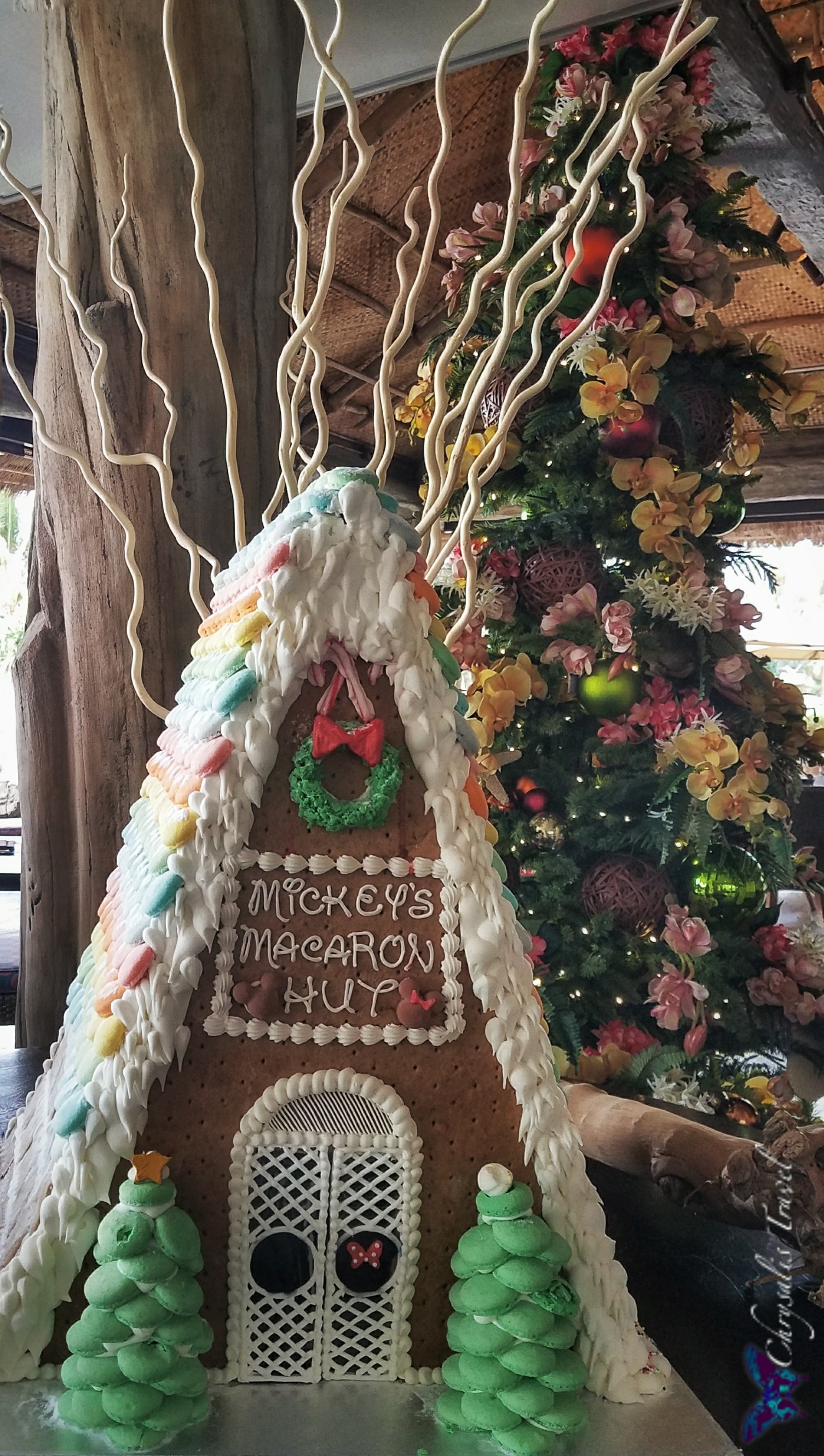 Ready to escape the snow and cold? Aulani is a great destination to celebrate the holidays! Enjoy tropical weather (an average 73o F) without sacrificing any of your favorite Disney holiday traditions. Dive right into the Christmas spirit with festive decorations in the lobby entrance.Hawaiian Menehune (miniature mythological creatures) have certainly decked the halls in festive fashion!