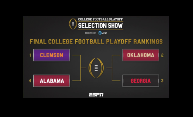 Today is the day for the College Football Semi-Finals on ESPN. First is the Rose Bowl Game Presented by Northwestern Mutual, featuring No. 2 Oklahoma vs. No. 3 Georgia (5 p.m. ET), then it is the Allstate Sugar Bowl, a rematch of the last two CFP National Championship Presented by AT&T with No. 1 Clemson facing No. 4 Alabama (8:45 p.m.)January 2