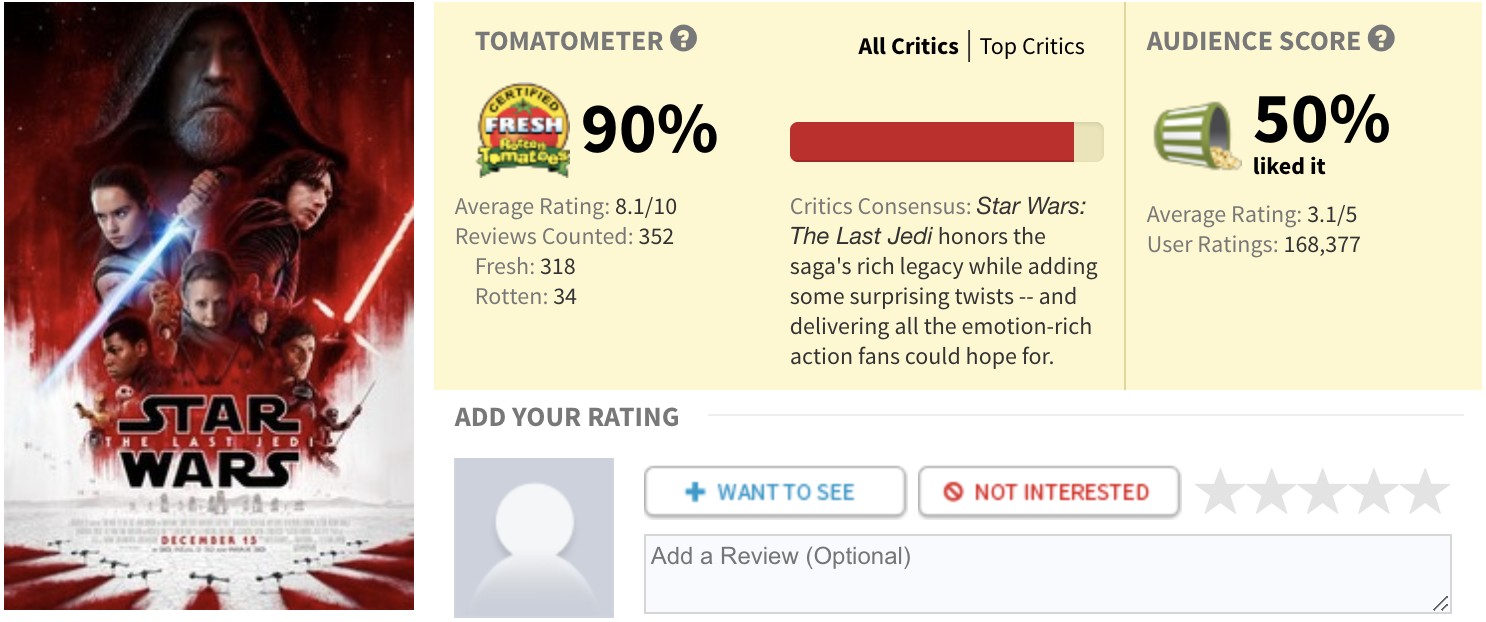 The King of Fools for 2018 are Angry Star Wars Fanboys/Fangirls. More specifically, the fans that took to social media, started petitions, and made multi-hour-long YouTube videos complaining about how The Last Jedi ruined the saga. As you can see above, some of the rogue fans brought the film's Rotten Tomatoes audience score down to a meager 50% despite it's Certified Fresh 90% critics score.Now, is The Last Jedi a perfect movie? No. However, the outrage its garnered seems disproportionate. Additionally, it's somewhat ironic that the big knock on the film is that it venture into too many new territories considering The Force Awakens was criticized for playing things too safe. Perhaps we can hope that Episode IX will serve as the Goldilocks of the latest trilogy?