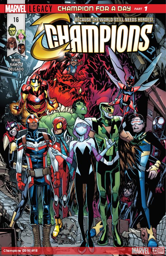 Champions #16 starts off with a reminder to all readers, “the world still needs heroes.” In this comic, we find the younger more millennial versions of our favorite characters looking to expand the roster of the Champions. The founders of the Champions, Nova, Spider-Man, Cyclops, Ms. Marvel, and Hulk, are all debating and recruiting their own personal interests to join. Patriot and the new Falcon are asked to join, as well as Red Locust, and even Ironheart.