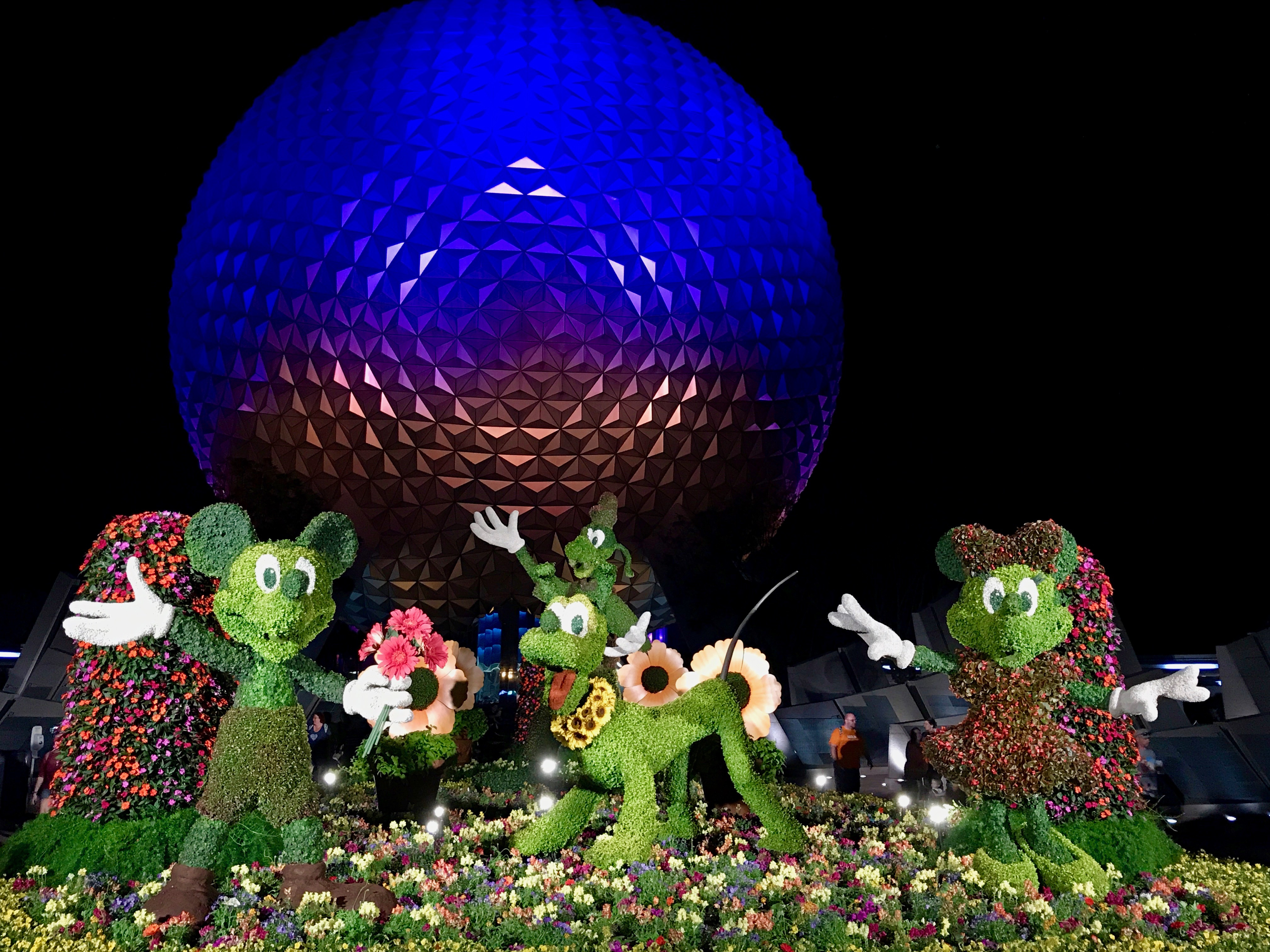 "Welcome to the Epcot International Flower & Garden Festival" Topiary at night.