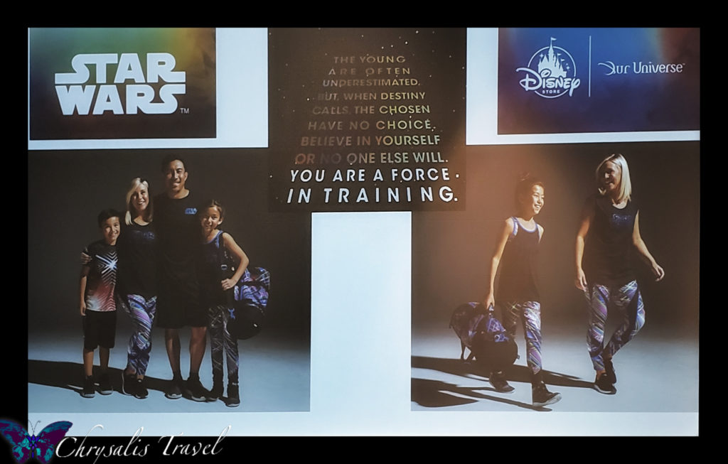 After the huge success of Her Universe, guys felt a little left out of the fan-fashion trend. Now, Ashley has included everyone in the family with Our Universe. This newest line features lifestyle clothing in fun themes.At the Disney Store launch last month, Our Universe featured activewear for kids and tweens with Black Panther and Princess themes. Pictured below are new Star Wars lightsaber-themed activewear pieces for the whole family. (Although, “this is not my family,” Ashley remarks with a smile).