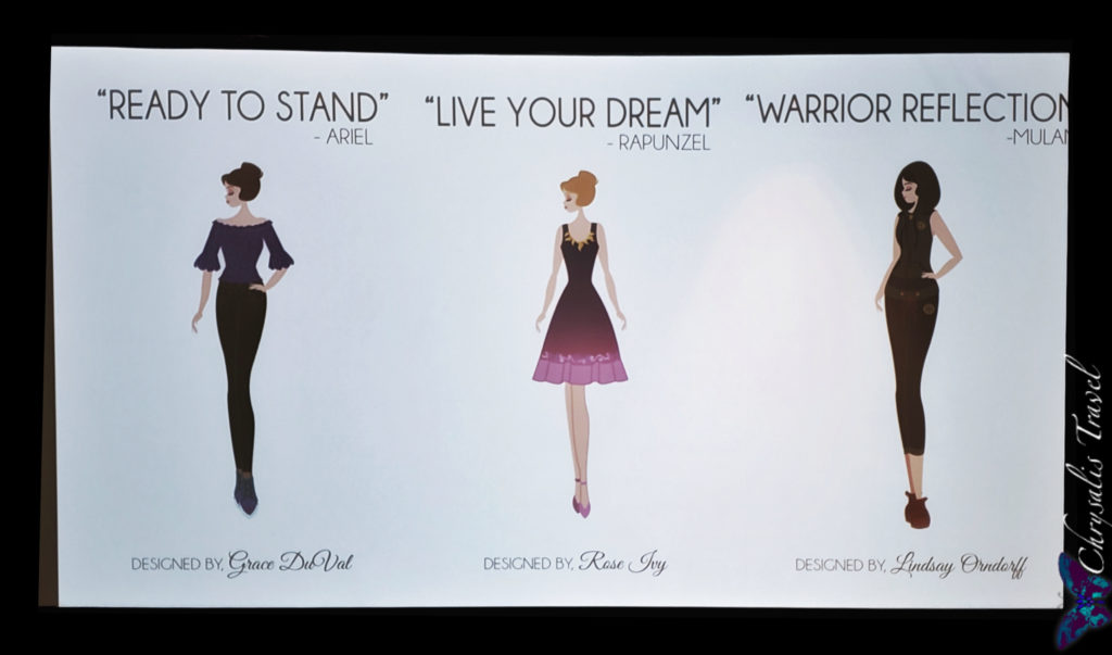 Each of the Fashion Show winners chose two Princesses. The panel revealed a concept drawing (by artist Ashley Taylor) of three creations. Designers then described their projects, although no other visuals were provided.
