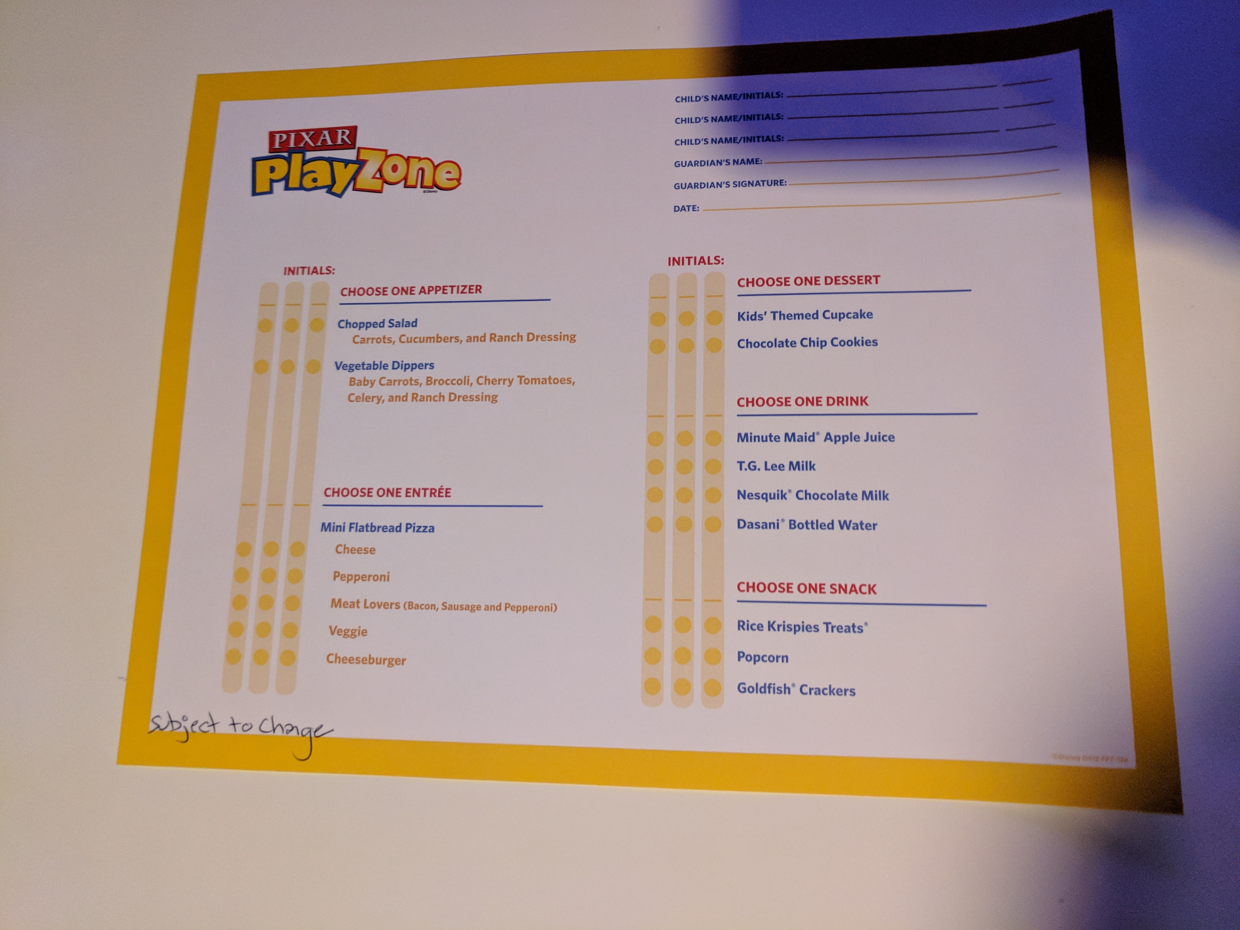 Pixar Play Zone opens at 5 p.m. each evening while their scheduled activity periods begin at 6 p.m. and the fun concludes at 10:30 p.m. Throughout the evening, your children can opt into the organized activities or enjoy the arcade games, crafts or toys available. Dinner and snack are also provided.