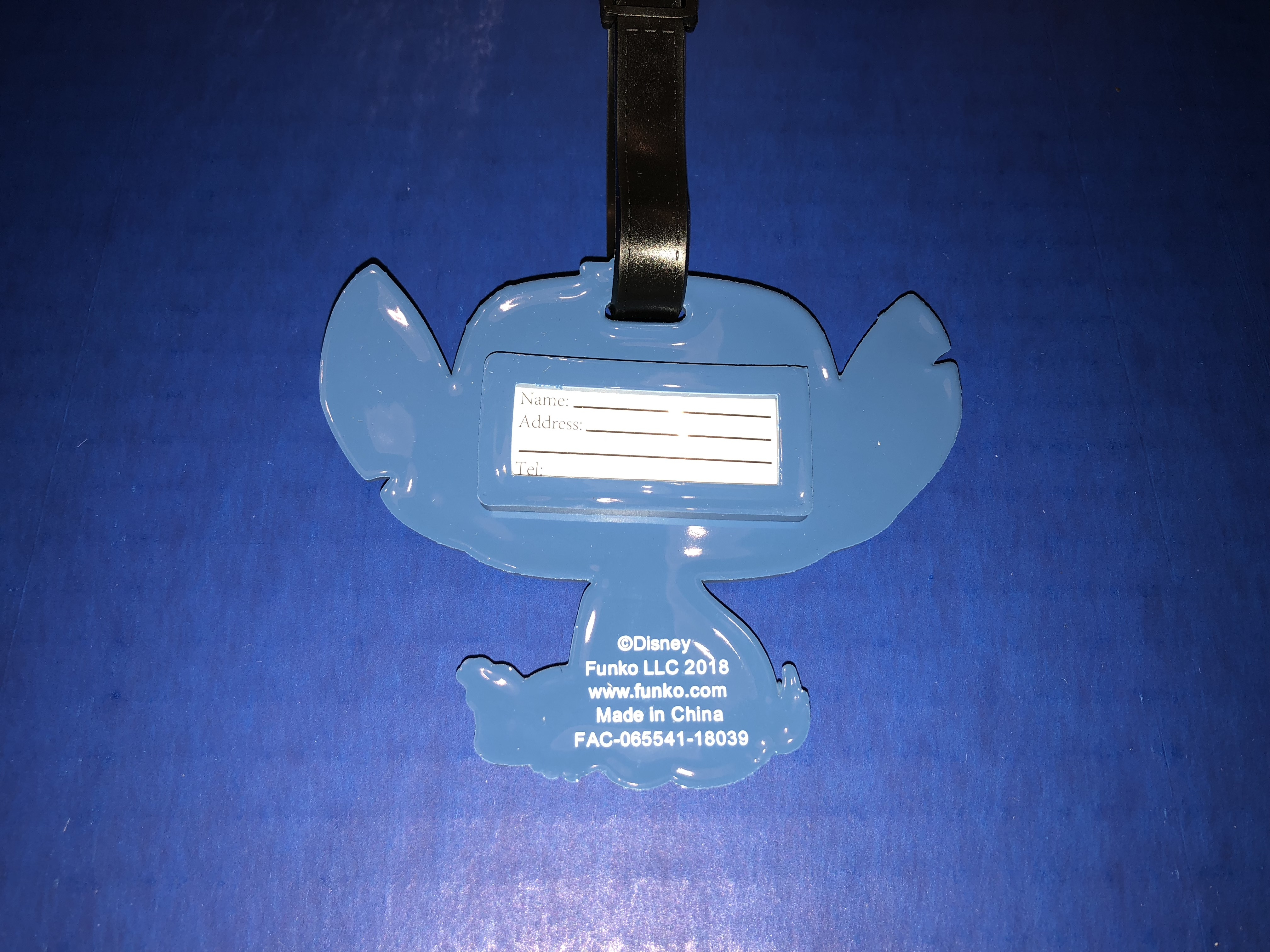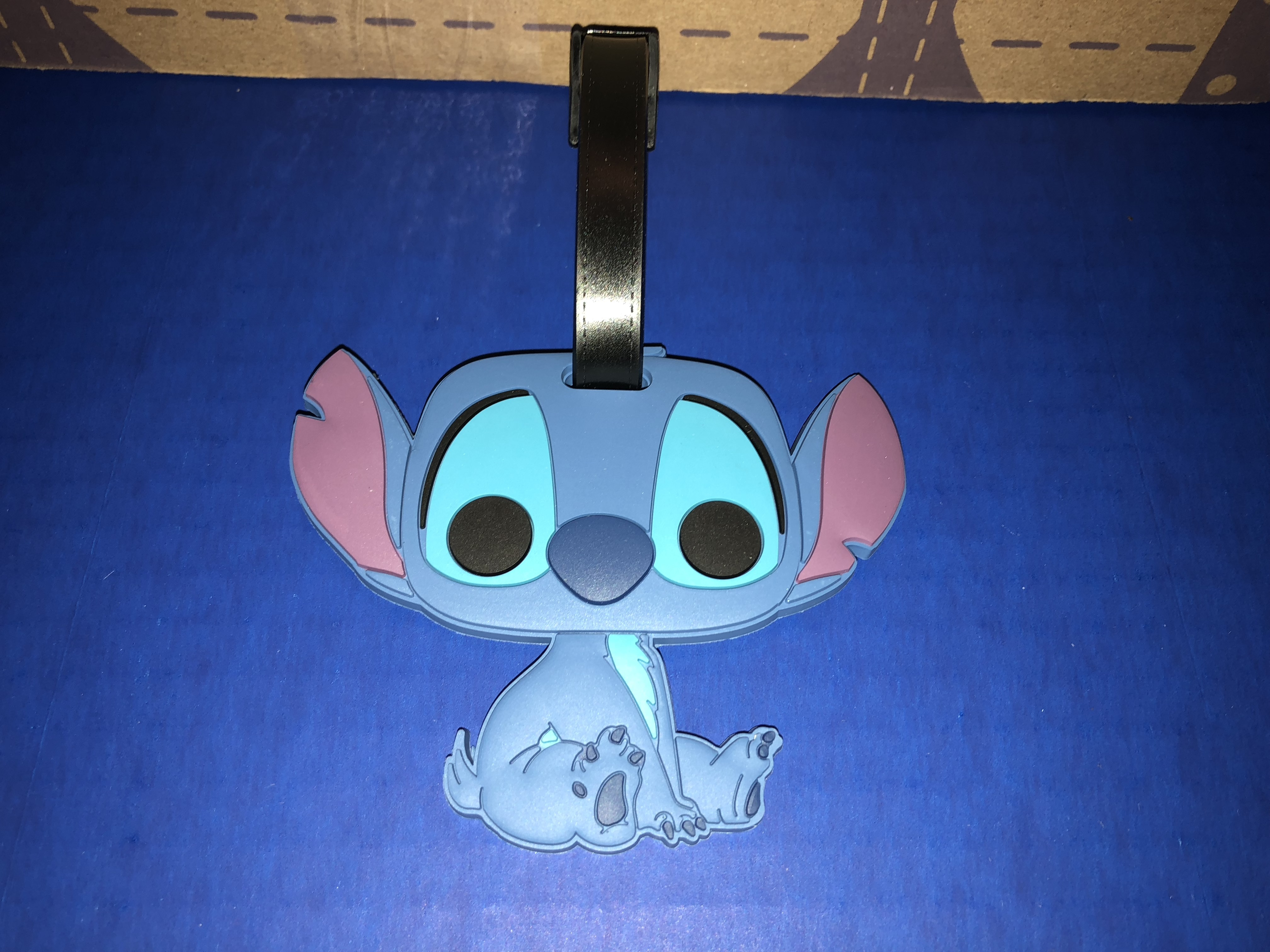 The first item I removed was a luggage tag shaped like Stitch. It's a soft, flexible rubber and the back has a window to the contact card. To remove the card, you have to take off the strap to slide it out and add your details. Stitch is ready for your next adventure!