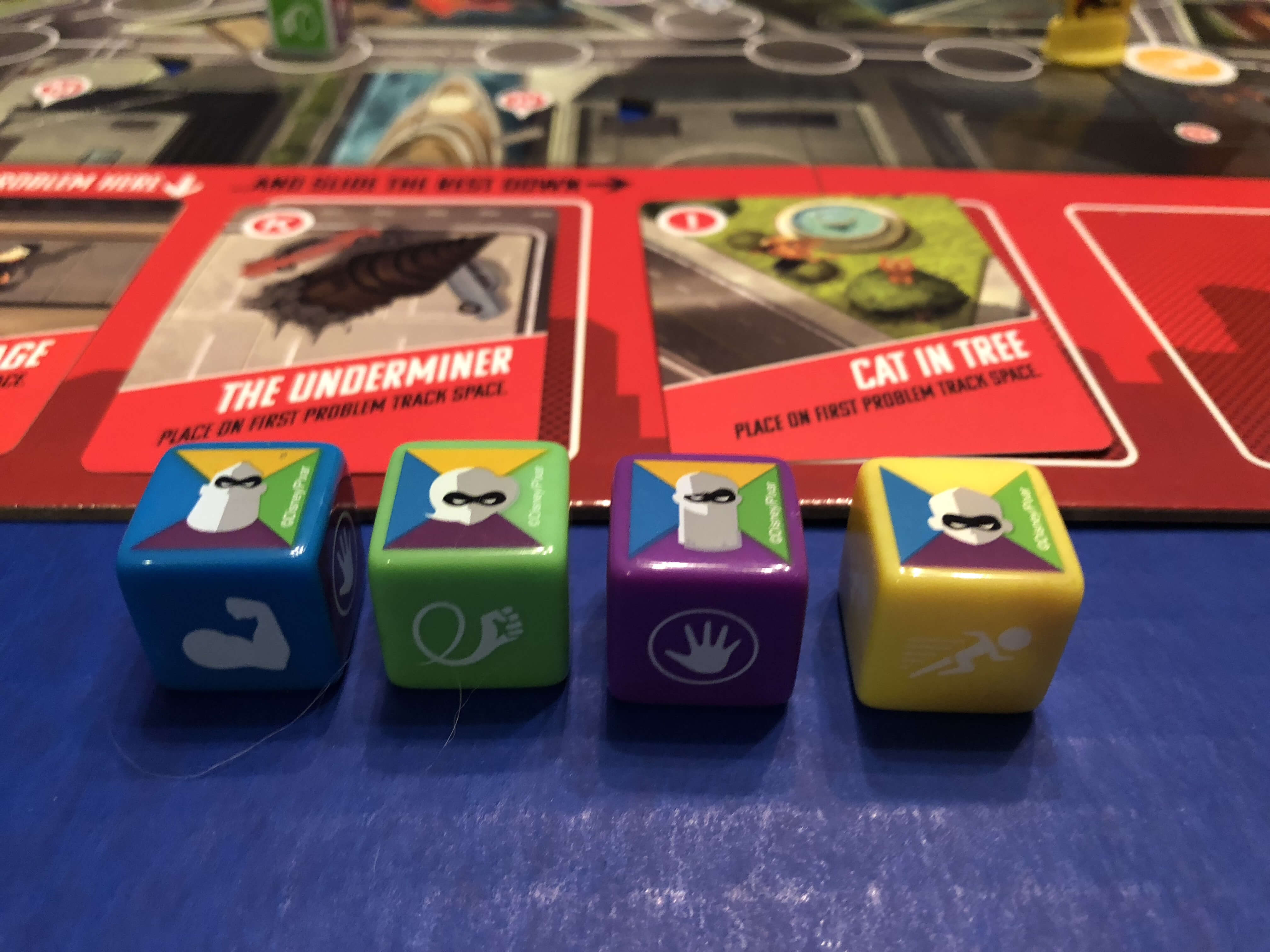 Of the six die that come with the game, one of them is the movement die, which each player rolls at the start of their turn. It reveals the maximum number of spaces they can move on their turn and if the number is accompanied by an alarm symbol, they must draw an alarm card. These can include assistance from other characters like Frozone or Edna, or they can put up road blocks that make it difficult to navigate the city (there are roadblock pawns that you place on the board following the instructions on the card). If you get a Problem Card, you add it to the bottom of the board and turn that space over. As problems on the board are solved, you turn the card over and Problem Cards keep moving down the line. The game is won by completing all of the problems before a face up card reaches the "Too Late!" space. If you reach that space, the game is lost by all players.