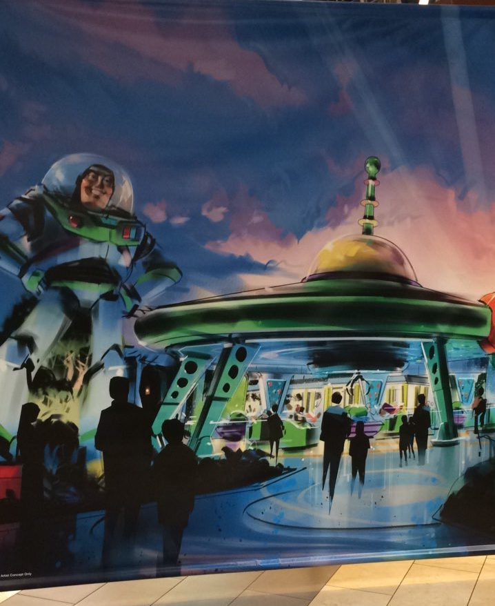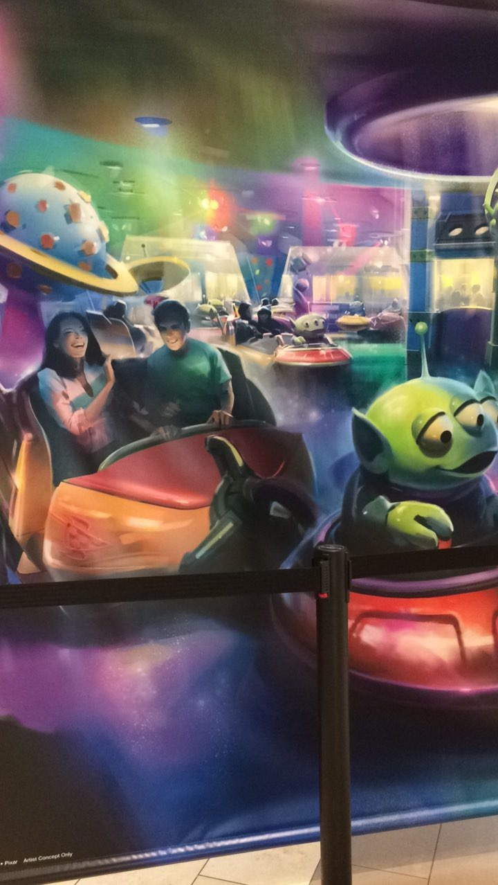 After the initial greeting we continued to the exhibit where there were several large backgrounds featuring concept art for Toy Story Land. There were also three photo spots that we had to check out. The first was standard picture in front of a blank background. Not exciting at all, but wait, there's more! We were told to pose looking up as if the claw was reaching down to grab us! After our "photo shoot" we saw the interactive digital clip: the claw reaches down and pulls up our picture. We then opted to have the clip sent to our email address as a keepsake. Here are our other pictures: