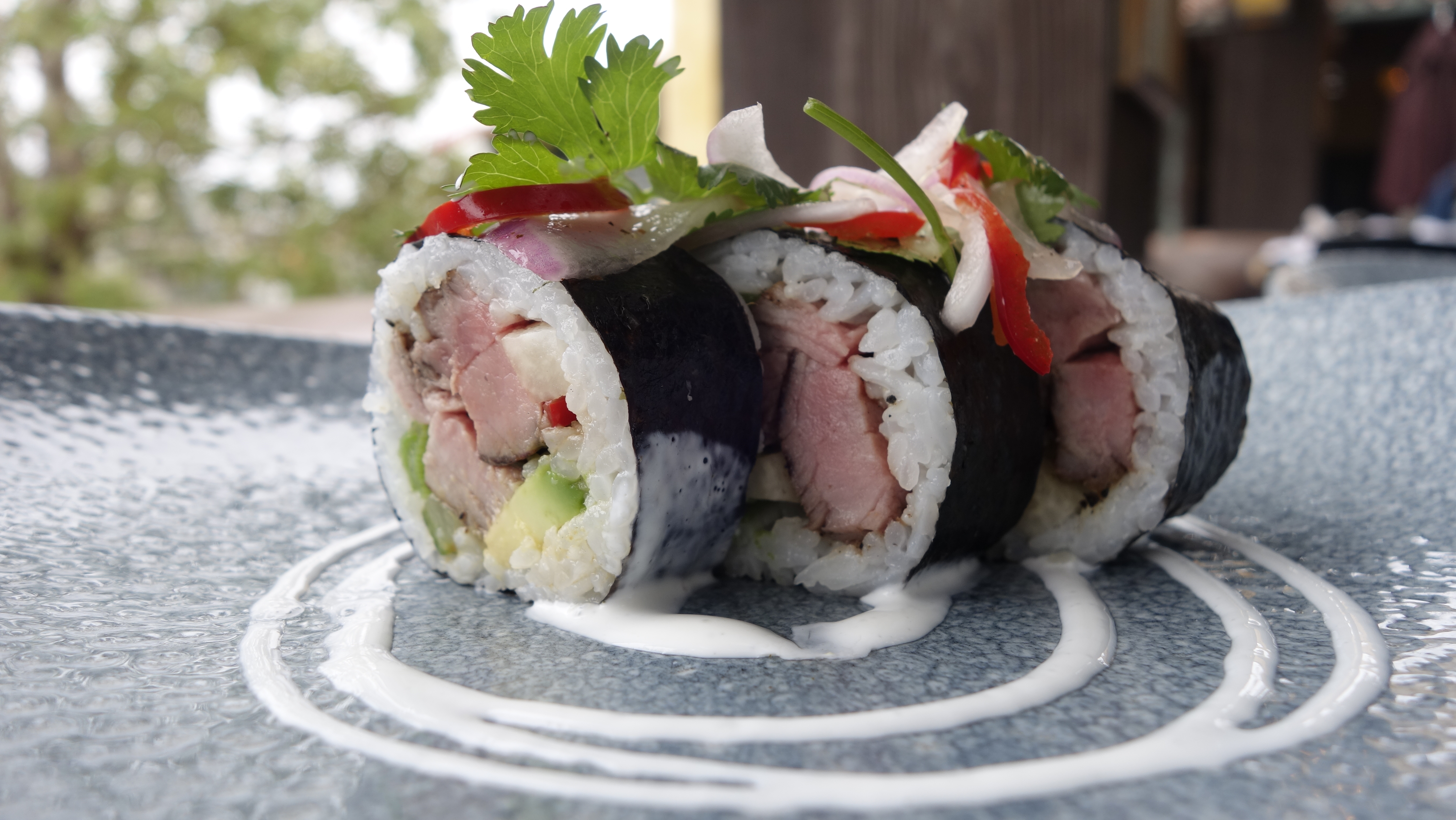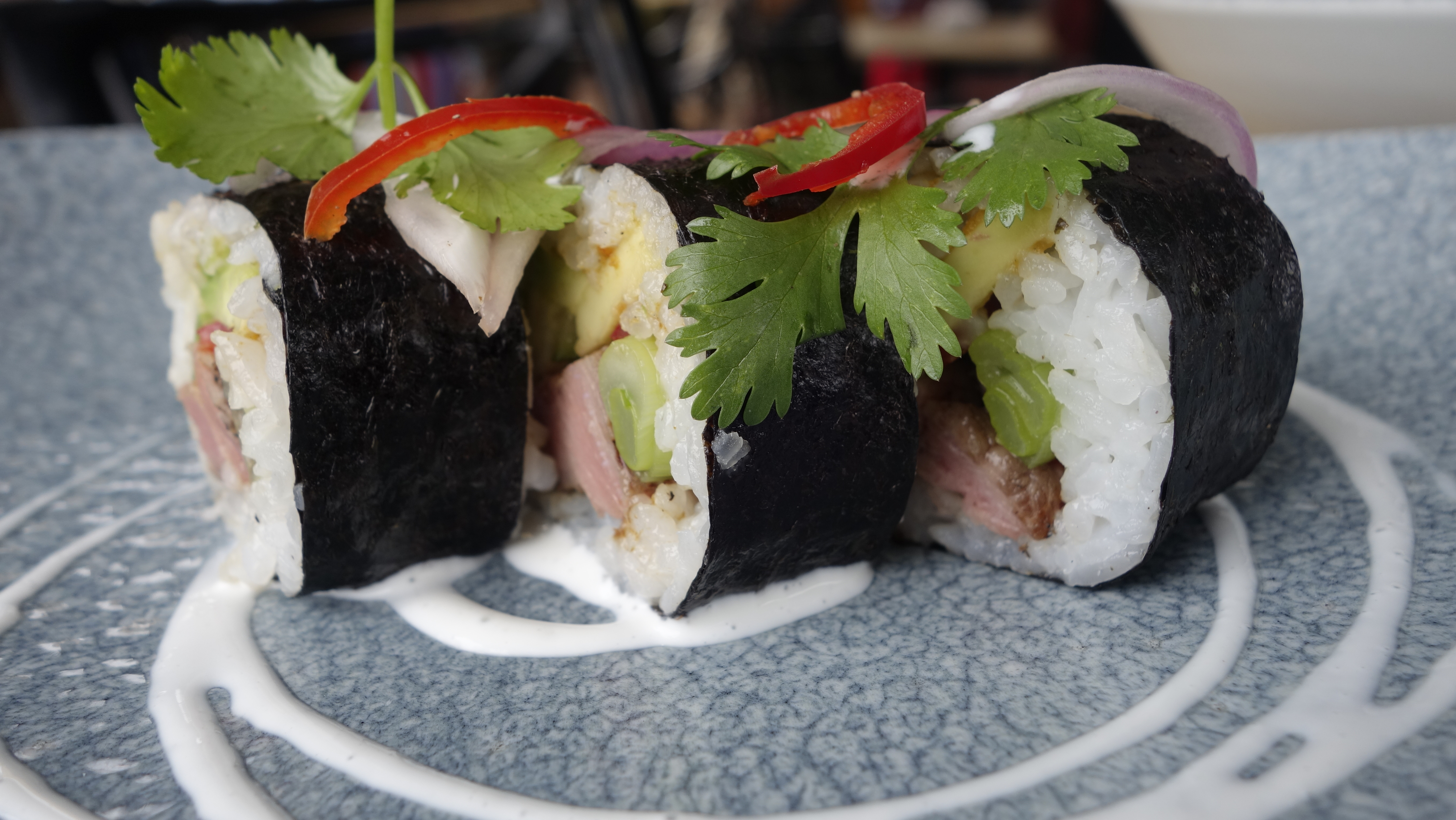 Contrary to popular belief, sushi is not raw fish, but rather the vinegared or seasoned rice. Think of this as a beginner's sushi. All of the traditional items are there: vegetables, protein, sushi rice, and a seaweed wrap. While it's hearty enough as an appetizer, it's less filling than the potato skins and it seems a little healthier. The New York strip steak was cooked to a perfect medium pink that added a texture component as well. The vegetables were crisp and the cilantro brightened up the entire dish. Definitely something to try whether it's your first sushi roll or you just want to mix things up.