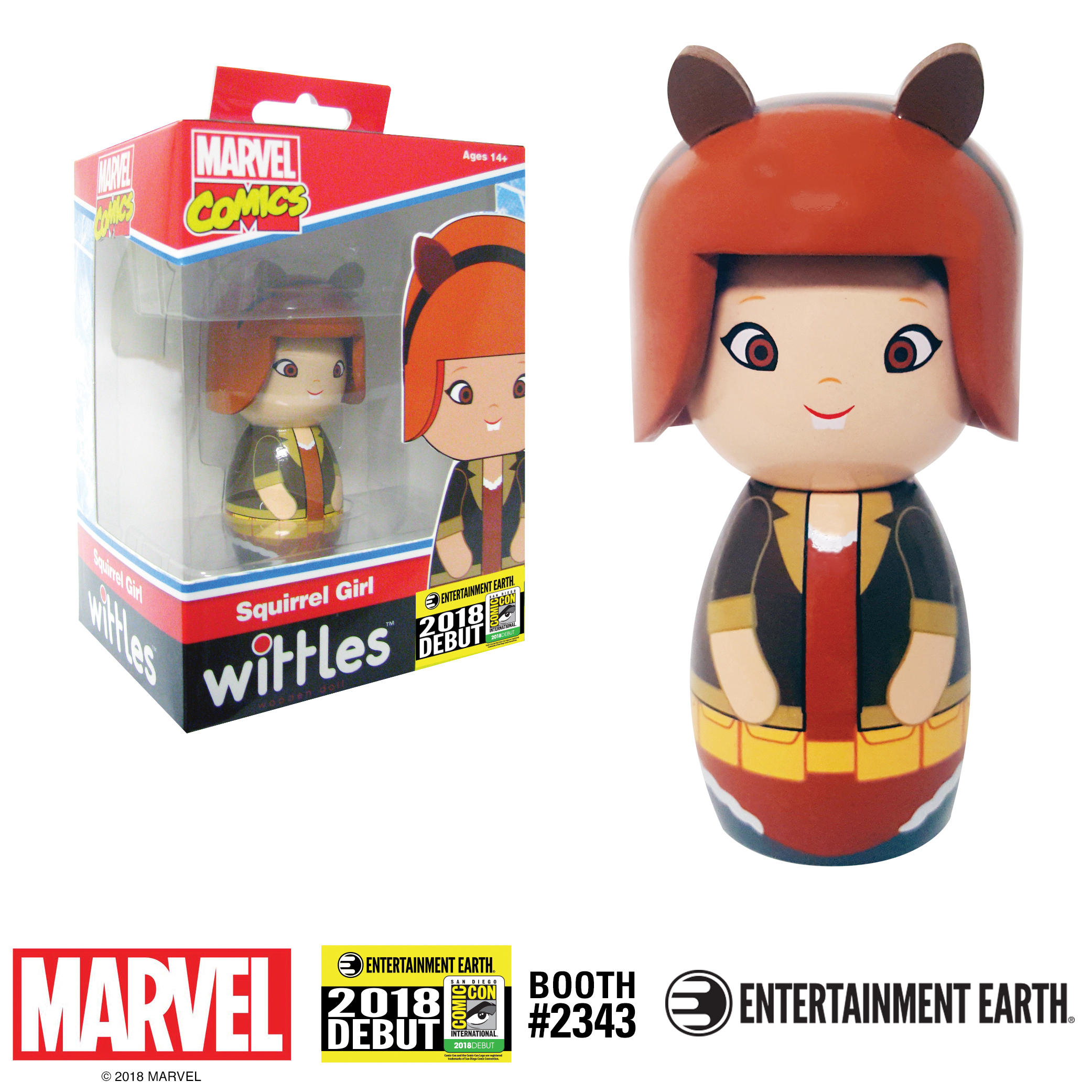 Continuing the wooden theme, Entertainment Earth is also debuting a Deadpool and Cable Wooden Push Puppet at the Con. Finally, the fan favorite Squirrel Girl is depicted in this Wittles Wooden Doll.