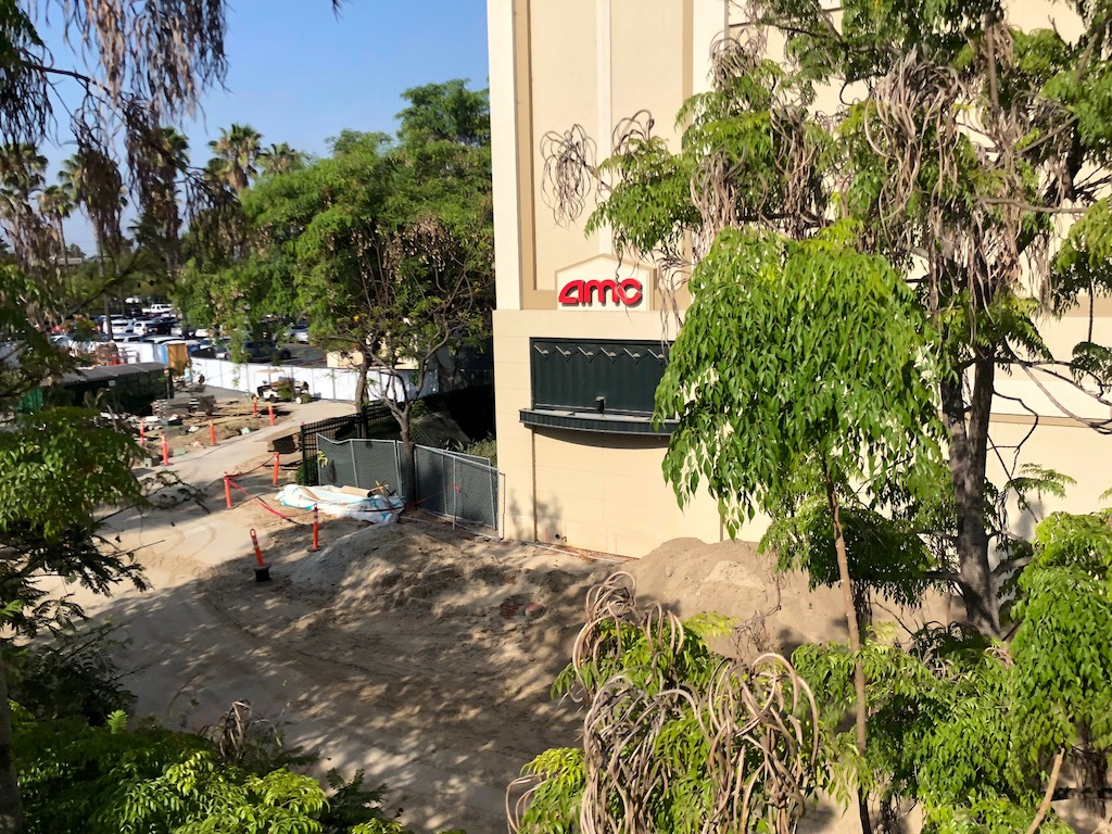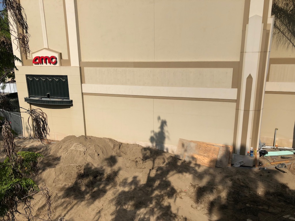 In contrast to new banners and construction on the north side of the AMC Theater, sun-bleached posters can be seen on the west end of the building.