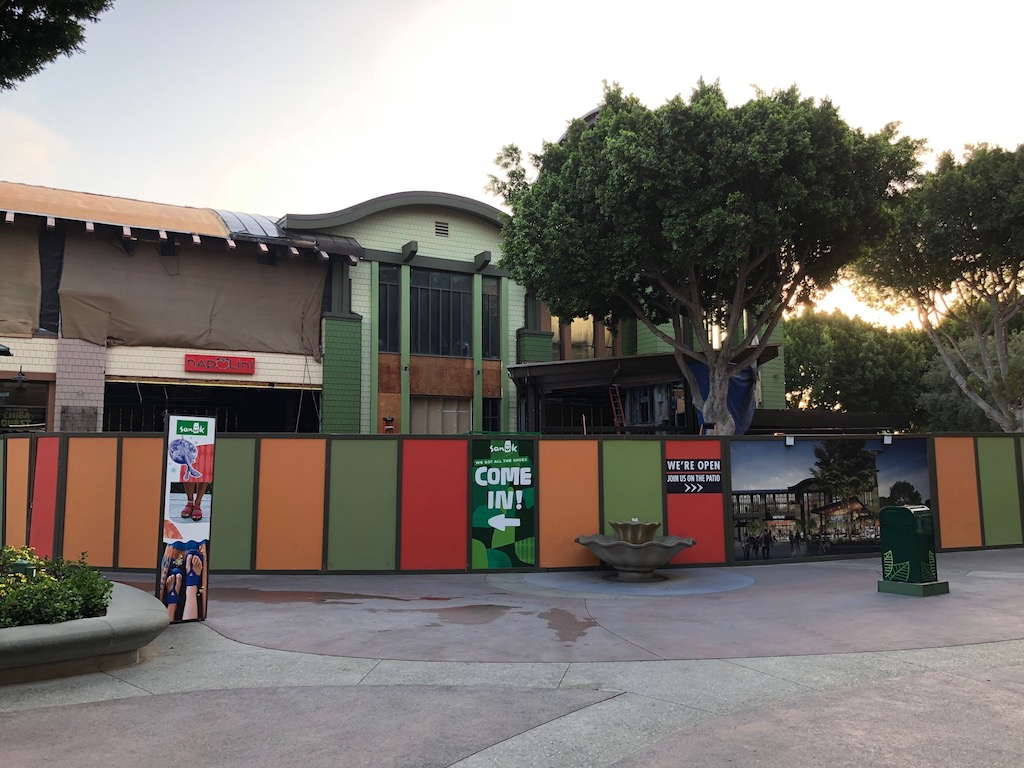 The former Haagen-Dazs and Wetzel’s Pretzels are behind construction walls