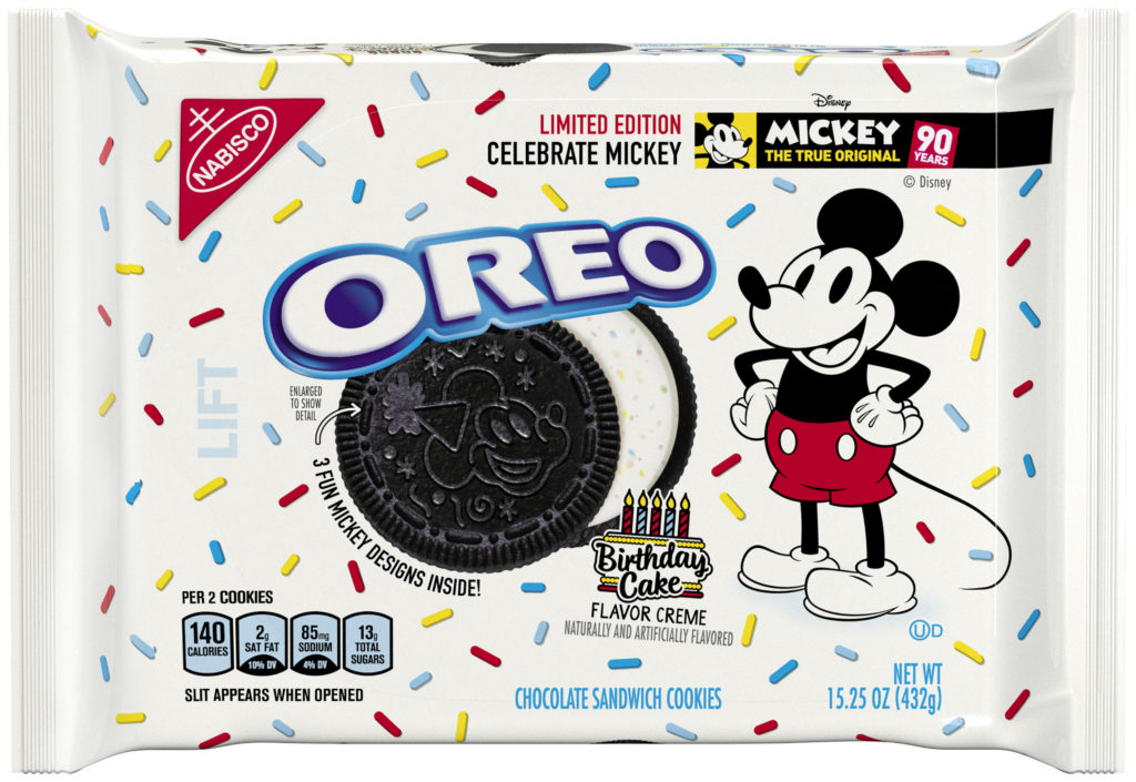 Disney has had a long history of partnering with Nabisco on themed products, but it's been a while. This was likely sparked by Disney's "Mickey Check" initiative of only partnering with foods that fit the image of a healthy diet. Oreos don't, but the good news is that for Mickey's 90th Anniversary, we get to live a little. It's a time to celebrate, and calories don't count on birthdays!!! Mickey's 90th Anniversary Limited Edition Oreos are in stores now.