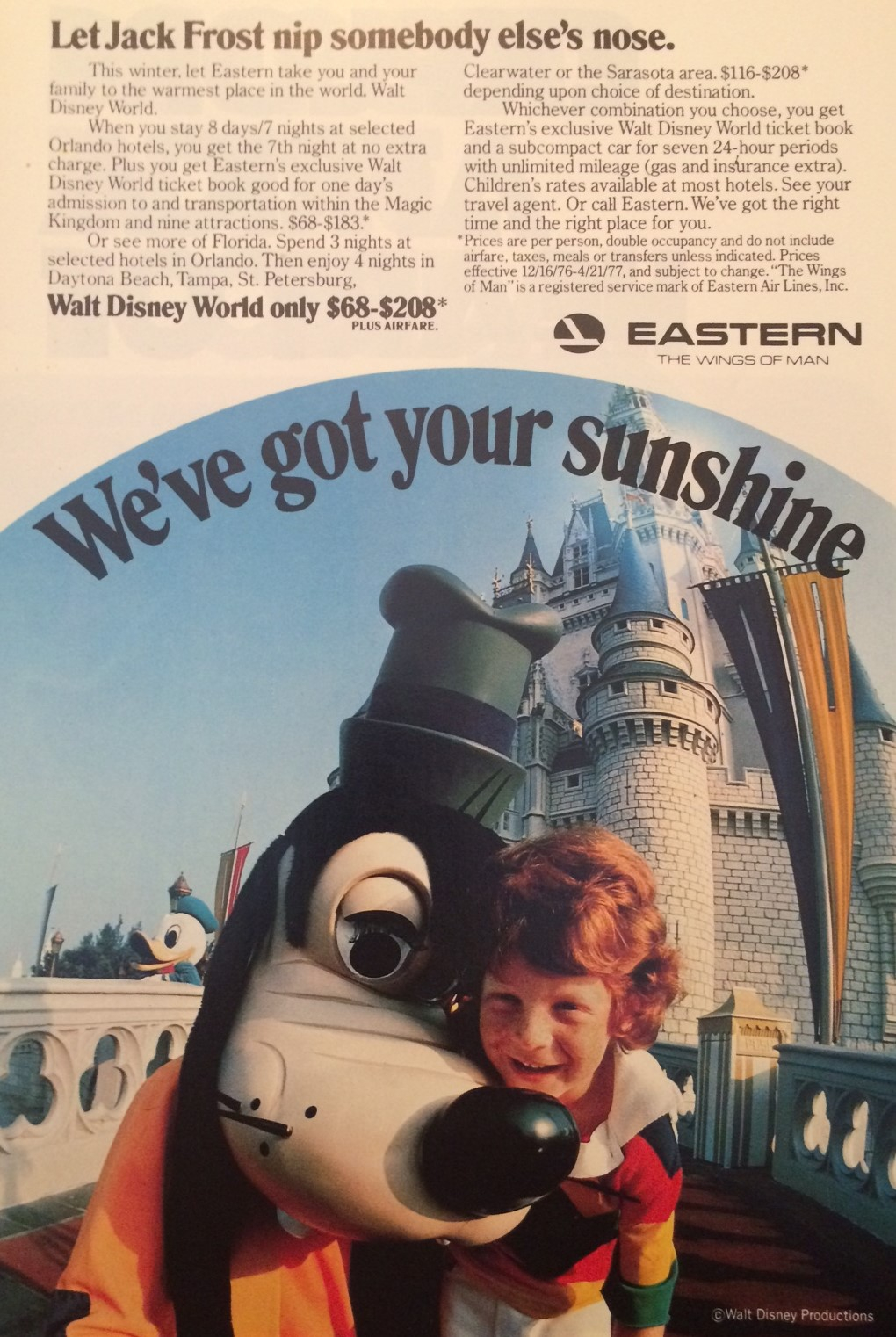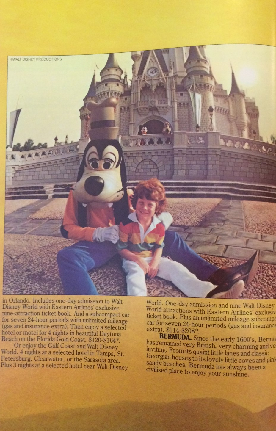 The same boy who met Goofy in the November 1976 National Geographic ad, shows up again in this ad. With the tagline of ‘We’ve got your sunshine’ Eastern Airlines is promoting their relationship to Walt Disney World and how affordable it is to book a Walt Disney World vacation through Eastern. You could enjoy Walt Disney World for the cost of $68-$208 as the advertisement says.April 1979 - National Geographic