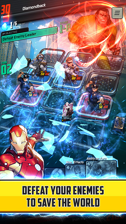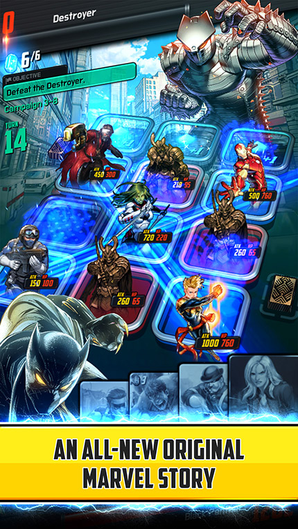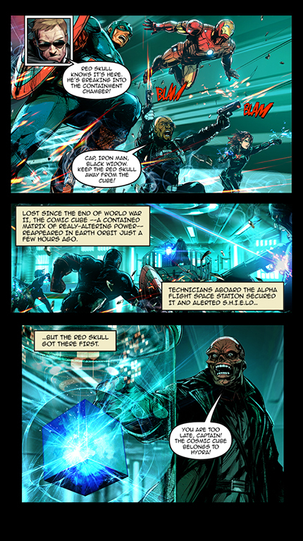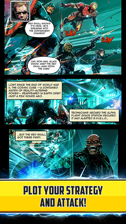 The game creates a brand new Marvel story that hits on all the classic plot points including a Hydra attack, a cosmic power and a mysterious portal to Asgard. It delivers the story via comic book panels which introduce some of the most iconic Marvel characters - like Captain America, Iron Man, Black Widow, Red Skull and more - almost immediately.