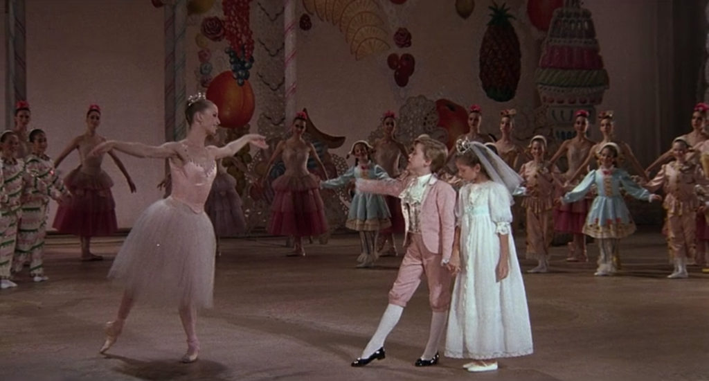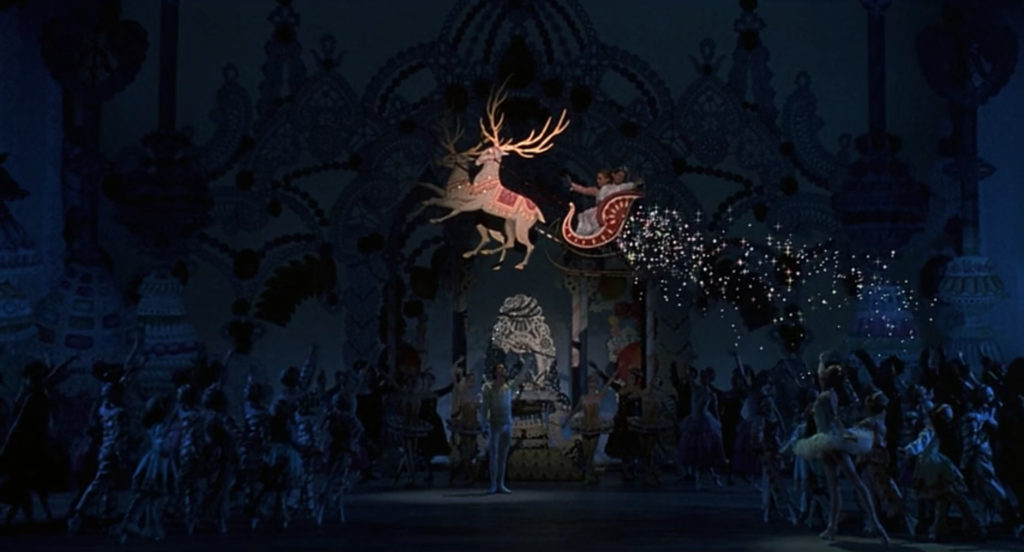 One of the theatrical elements used in most productions of the ballet, including this film, is a photo scrim curtain with a door, which the kids peer through to spy on their parents getting ready for the Christmas party. It always reminded me of the scrim screens on either side of the stage in Disney’s Carousel of Progress and I loved it for that reason. The film features a few effects shots, but makes no attempt to hide wires when characters or objects “fly.” The only use of computer effects appears to be a trail of magic dust that falls off the back of the sleigh as Clara and the prince fly away at the end.