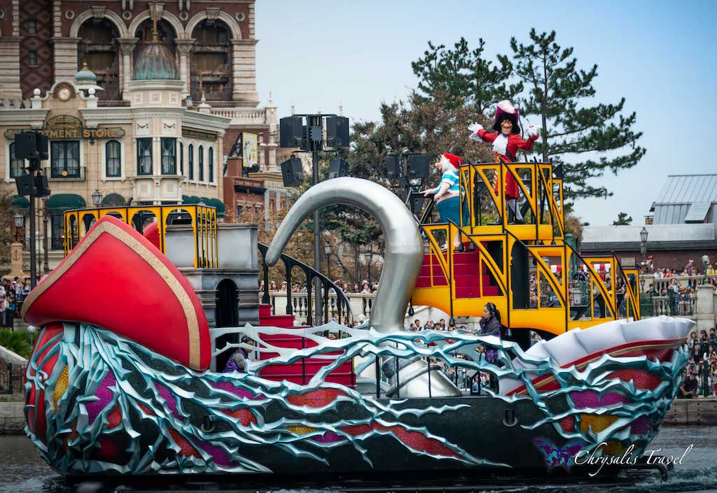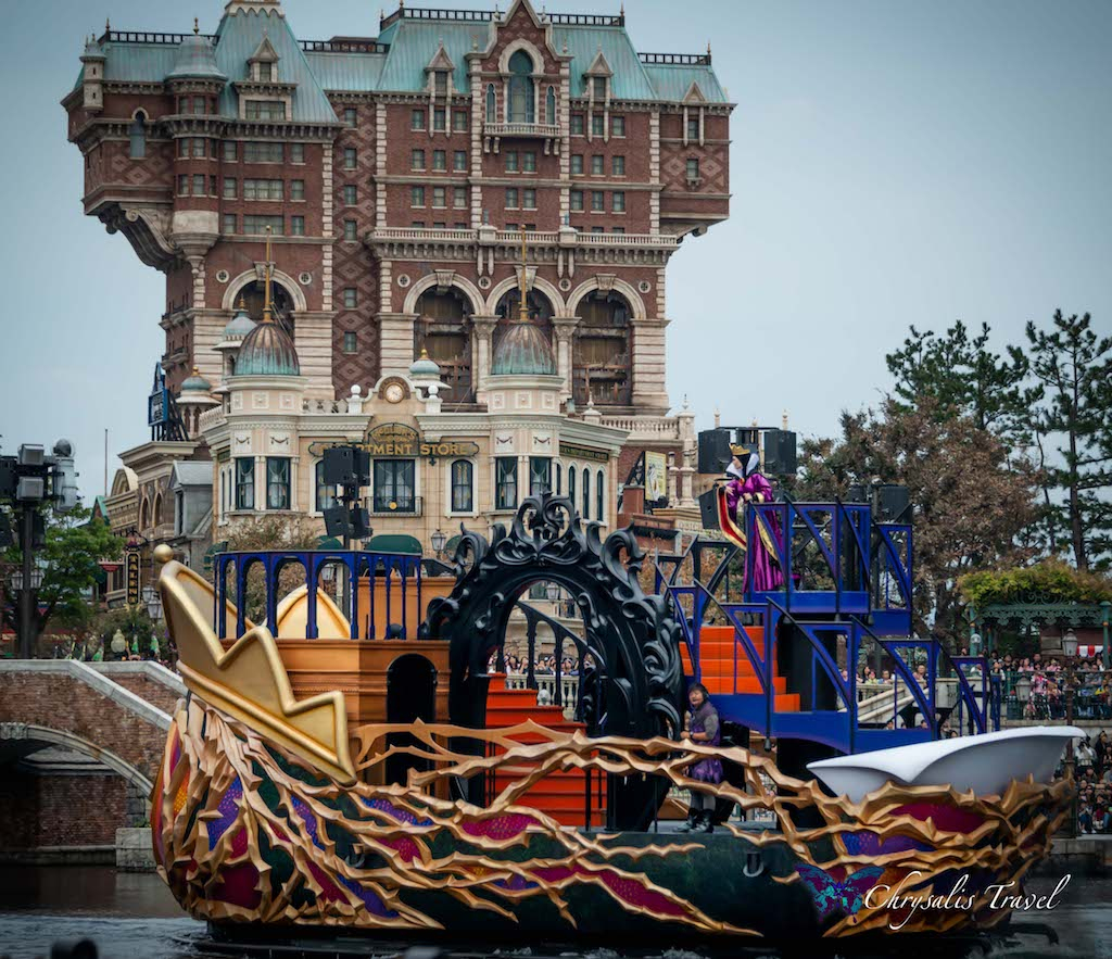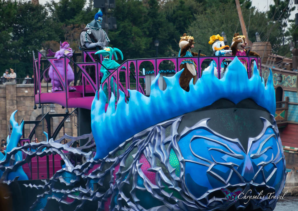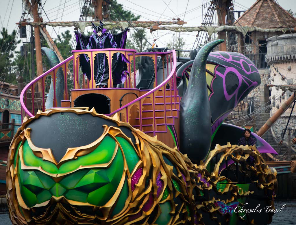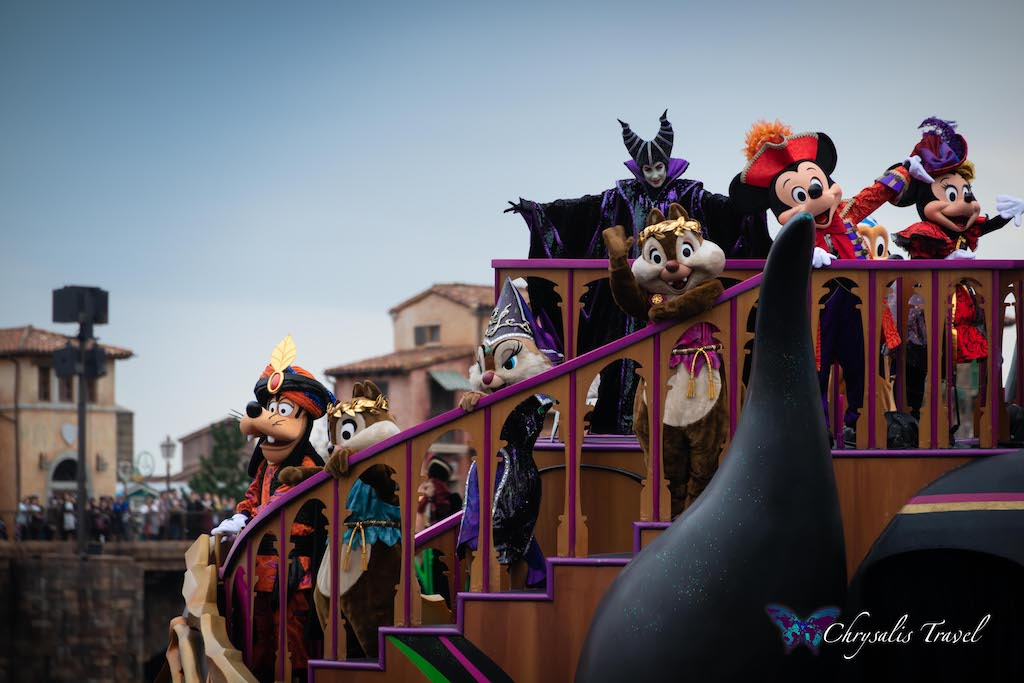 Halloween at Tokyo DisneySea means the return of “The Villains World” – a 25-minute water spectacle involving five ornately-decorated ships, 120 stage performers, and some of your favorite Disney Villains.Mickey and friends are invited by the Villains to attend their Halloween party. “Out of respect,” says the Tokyo Disneyland website, they coordinate their costumes with those of the Villains. Each Villain in turn gets to showcase their particular style, supported by themed dancers around Mediterranean Harbor.