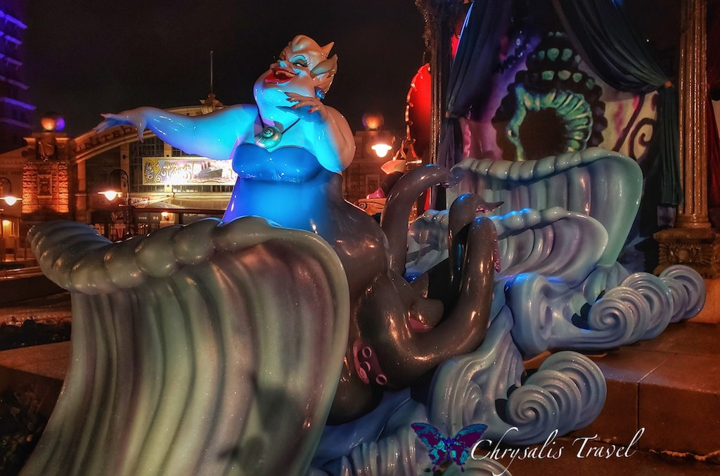 Ursula. They looked great during the day, but even more impressive when lit up at night. And they were popular photo-ops (the PhotoPass photographer stood in front of Ursula).