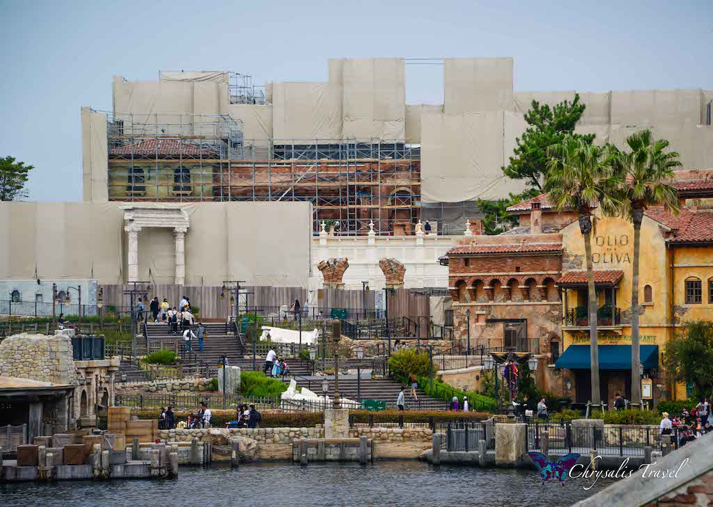 Last month, Tokyo DisneySea released a concept photo of their “Soaring Fantastic Flight” attraction. It has a beautiful Italian-style façade. From across Mediterranean Harbor, we captured this photo of the scaffolding starting to come down, revealing the detailed brick work of the ride building.Walking next to the construction, we could see some of the faux-marble walls up close. They blended in so well to the existing Mediterranean Harbor waterfront – it is a perfectly natural extension.
