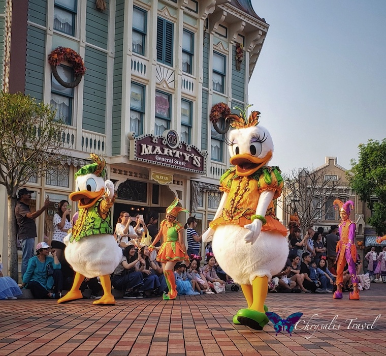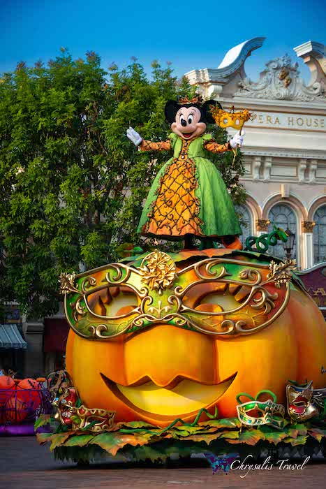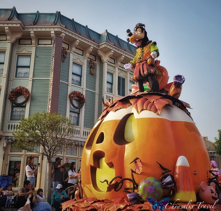 There were two daytime parades during our visit to Hong Kong Disneyland. One was the ongoing “Flights of Fantasy” parade. The second was the seasonal “Mickey’s Halloween Time Street Party!”The “Street Party” was a playful parade with walking and stop segments. We were positioned on Main Street in front of the Emporium. Some performers rolled large carts of inflatable jack-o-lantern balls. From our vantage point, the parade went by, and they never used the balls.