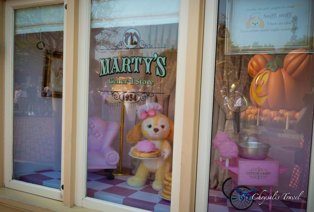 Here is Cookie’s display in the window of “Marty’s General Store.” The store is named for late Disney Legend and Imagineer Marty Sklar, who contributed to designing HKDL. The window is dated 1934, in honor of Marty’s birth year. Do you see the giant Mickey pumpkin in the reflection?