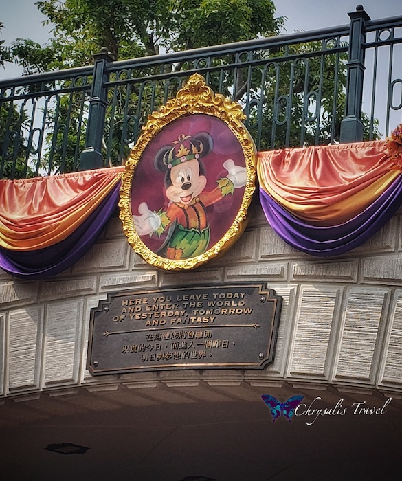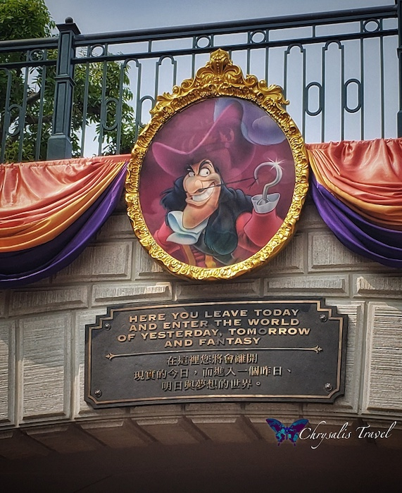 Remember the entry plaque at Disneyland? Here is the entry plaque at Hong Kong Disneyland – Walt’s words are translated into Chinese. A portrait of Captain Hook graces the railing above.