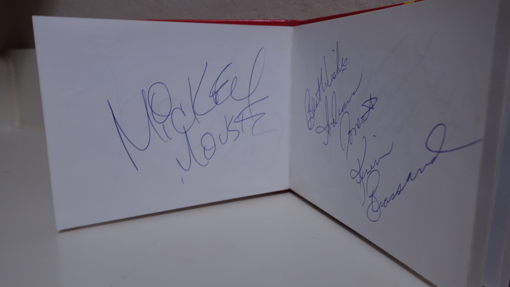 From the time I was old enough to understand what an autograph book was, I wanted one. Finally, in 1996 I got one! I don’t remember what outfit Mickey was wearing, but I know we met him at MGM. Yes, folks, I’m that old, and began my visits to Walt Disney World before Animal Kingdom came to be and while Hollywood Studios was MGM. I remember when we met Mickey my dad was frustrated because it was taking so long and we were missing out on shows. At the time, I felt that Mickey appearances were so rare that this was the one character we should wait for. All in all, I was thrilled to meet the main mouse and get his autograph. Side note, the other autograph pictured belongs to the stunt actor playing Indiana Jones at the Stunt Spectacular. As of 2012 he was still working the show but as one of the “producers!”