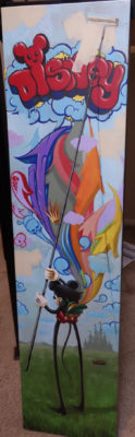 As my aforementioned Vinylmation addiction grew, I found myself spending a lot more time at the now-defunct D Street at Downtown Disney. That’s where I saw this interesting piece on display one day and decided to bring it home. At this point, my rented room was bare, so I figured I should add a least a little color to it. Frankly, I don’t think I ever actually bothered to hang it, but just resting it against the wall was good enough for me. Now, I’m not a huge fan of graffiti art or anything like that so I’m not sure what about this jumped out at me, but my best guess is that I just enjoyed the colors and eye-catching design. In any case, looking at this now brings back memories of living in California, visiting Disneyland weekly, and apparently having a lot of disposable income to waste at the parks.
