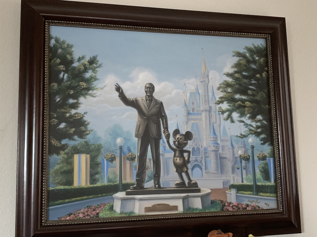 I love this painting of the Partners Statue at the Magic Kingdom by Maggie Parr. To me, it catches the park right before it opens for guests. That special magic that is right before rope drop but everything is prepared to make magic for those that are on the cusp of their arrival. Emotionally, this painting represents to me becoming an adult. While I admired it for some time, it was the first purchase I made for myself after I got promoted and finally had disposable income. At the time, this was a major purchase, so I wanted to have something that was special. This painting that shows the potential Walt and Mickey represent for the Disney experience, is the reason I wanted to add it to my collection.