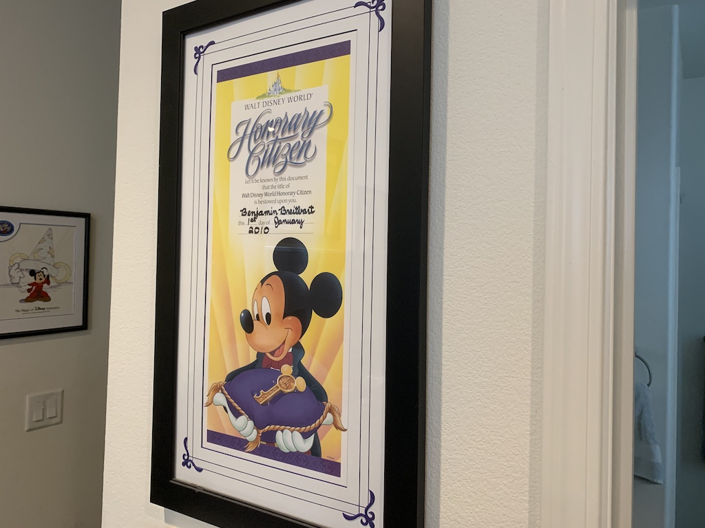 This Honorary Citizen certificate was given to me after a career defining event. The fact that someone went out of their way to send this to me meant a ton. It still sits right by my bed as a reminder that I played a role in the Disney experience that was worthy of such an honor. In my head, I know that there was no committee that decided I deserved this or a specific accomplishment that warranted it, but my heart knows that it took a moment to prepare, frame, and mail, and that still means the world to me.
