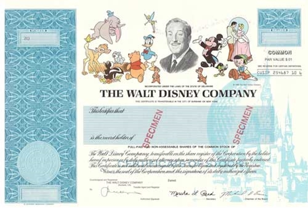 While this is not actually a picture of my stock certificate, since it is in a safe deposit box, mine is a treasured “Mickey” item. When I got my first set of shares when I was 13, I could actually say that I owned a part of Disney. While this outdated certificate is no longer` available, and Disney has moved to a non-certificate form of ownership, I still treasure mine for what it represents. Looking at it, it is funny to see how the organization has grown since this certificate was first issued in 1984. While Marvel, Pixar, Star Wars, and the second golden age of animation have brought new charised friends to the Disney pantheon, Walt and Mickey will always play a central role.