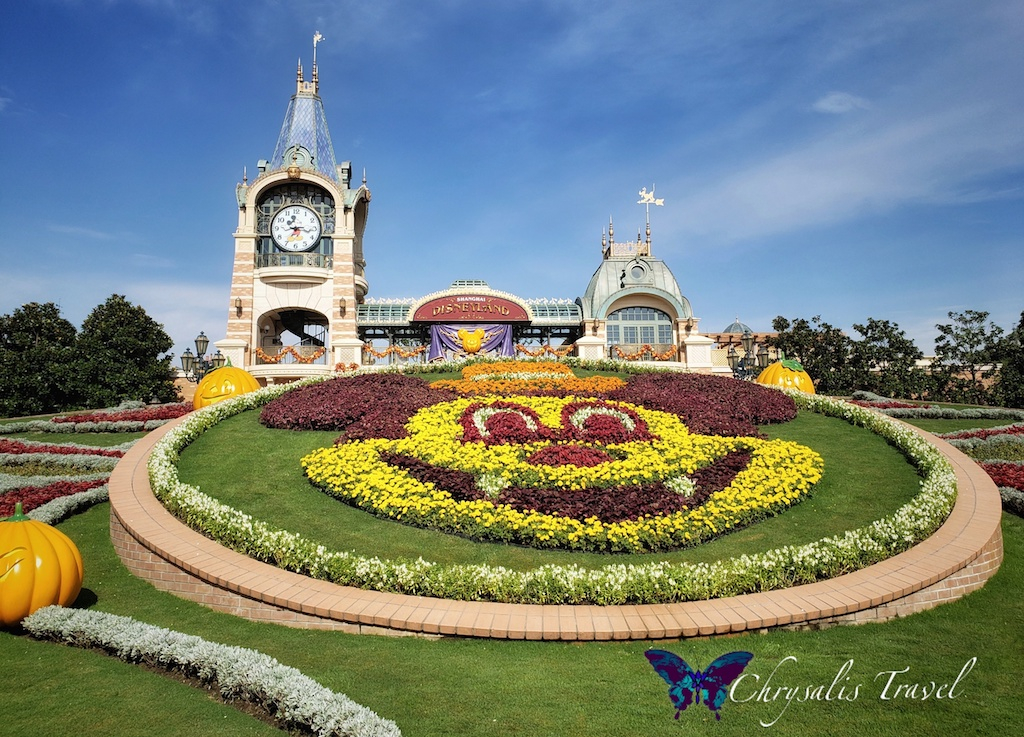 A cluster of pumpkin Disney characters were perched atop the entry gates. These were very similar to ones we’ve seen in our domestic Parks.We love Minnie’s polk-a-dots! The sign below her advertises upgrading a full-priced one-day pass to a half-year pass (annual passes don’t exist at SHDL).